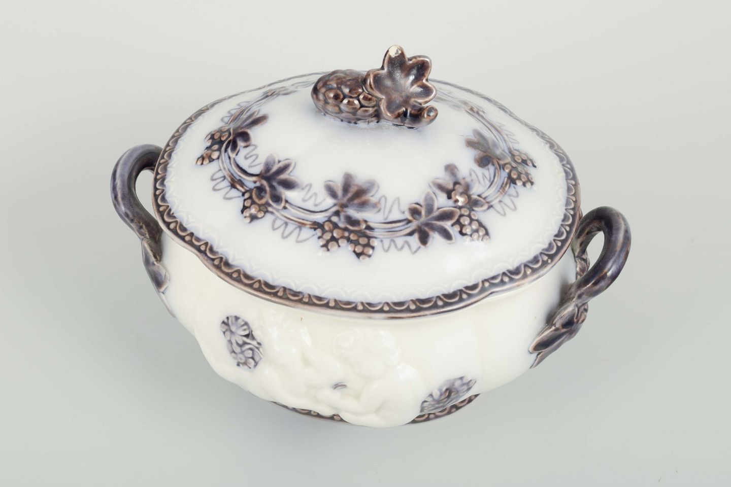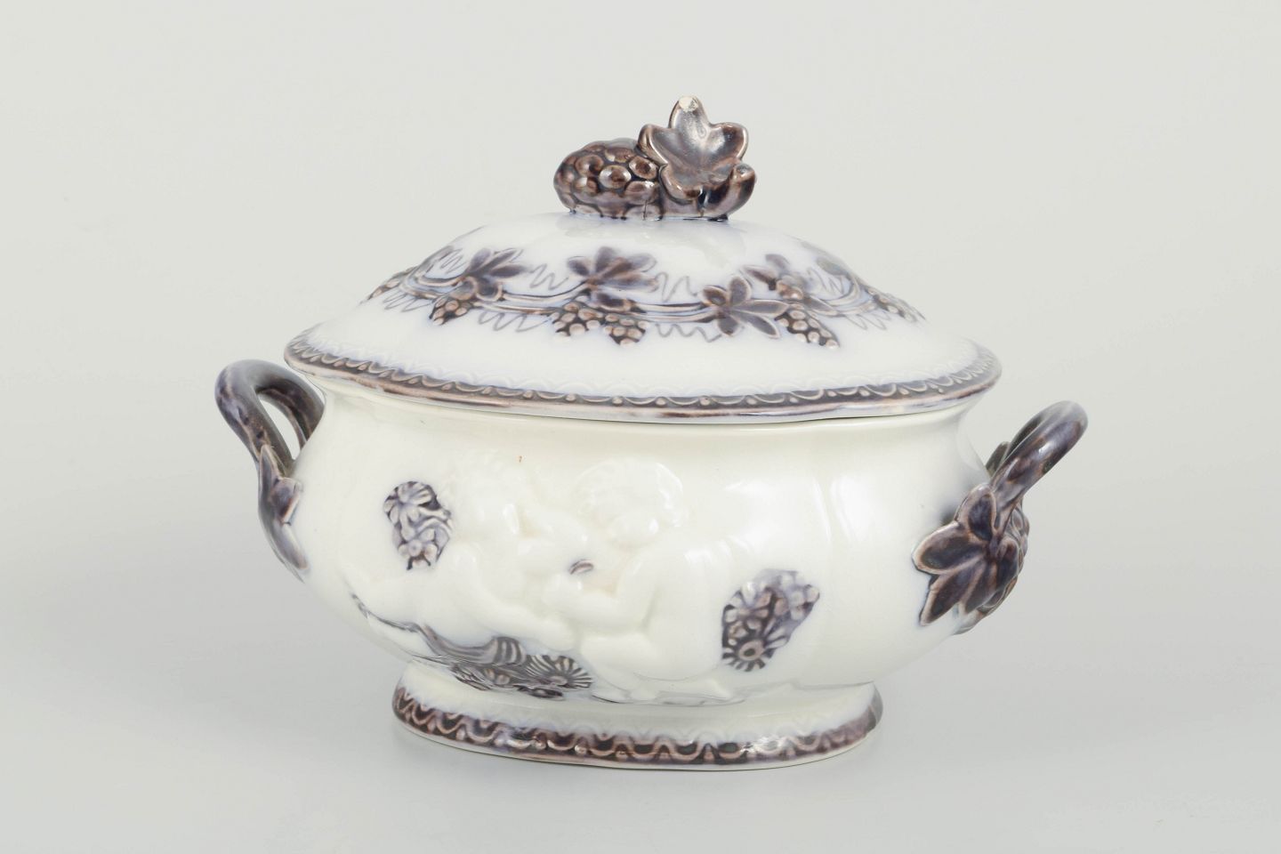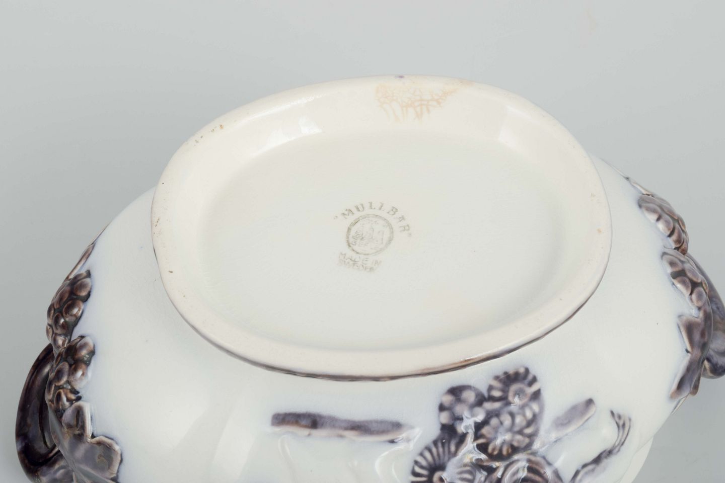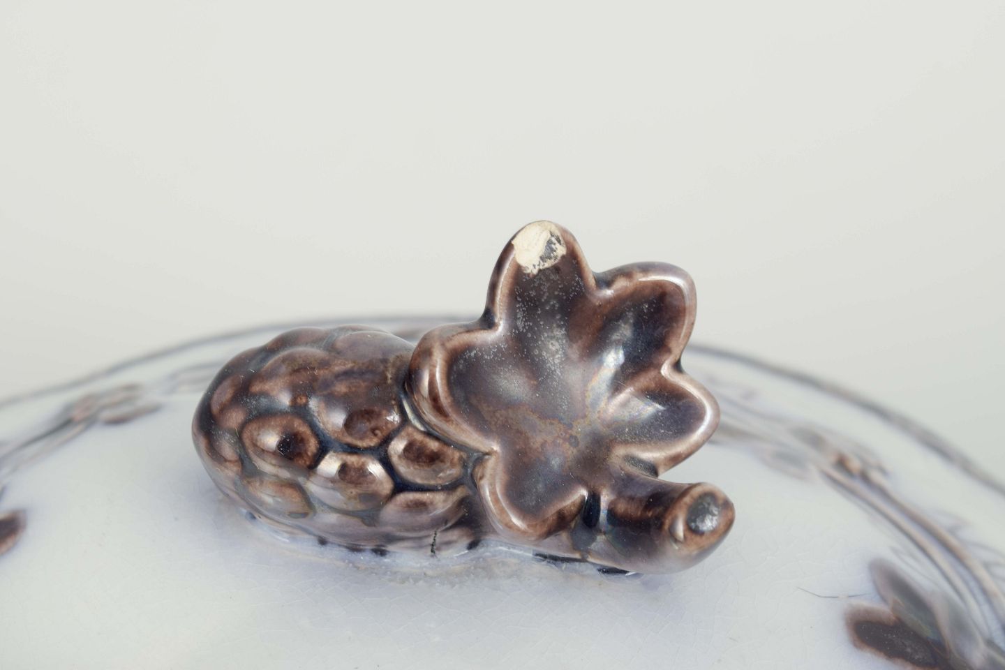 Terrin “Mullbär”, ca. 1880/90’erne.Oval fajanceterrin med låg, formet med dobbelt hank og knop udformet som drueklase og blad. Dekoreret med relief- og transfertryk i brunlig tone med vinrankemotiv.