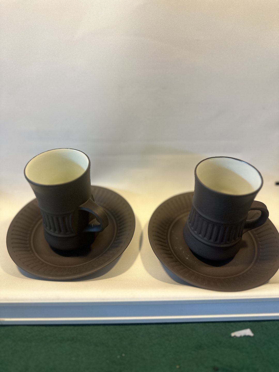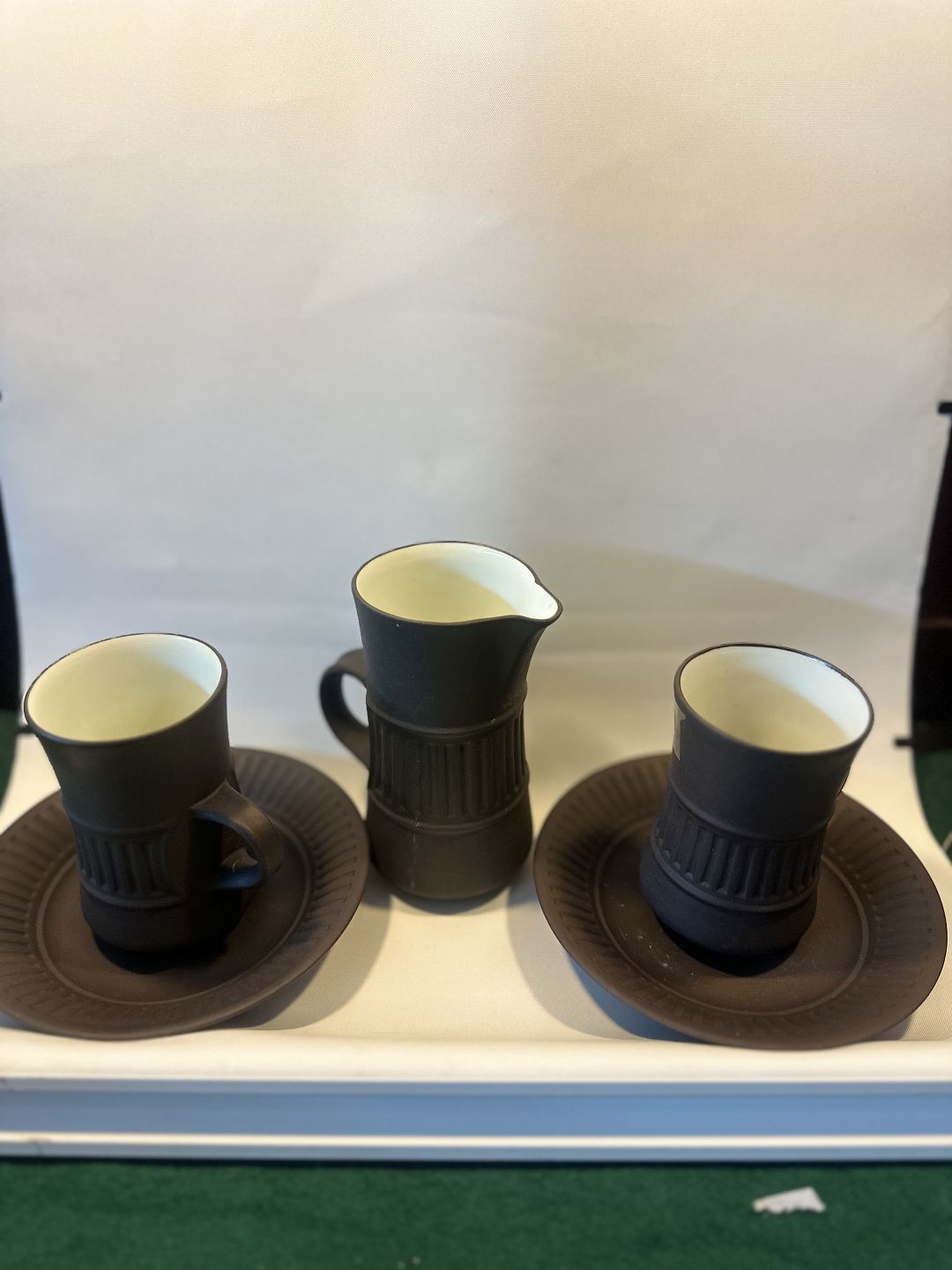 Steingut-Teeservice von Jens Harald Quistgaard aus den 50er Jahren. 4 Teetassen mit Untertassen, 1 Milchkännchen, schöner und ordentlicher Zustand Händler