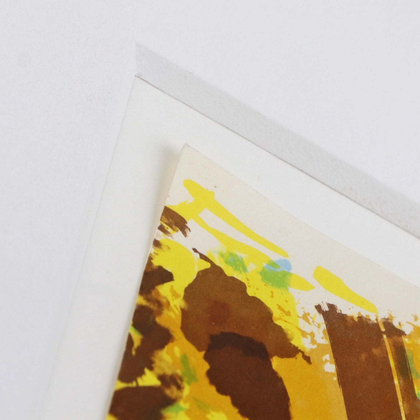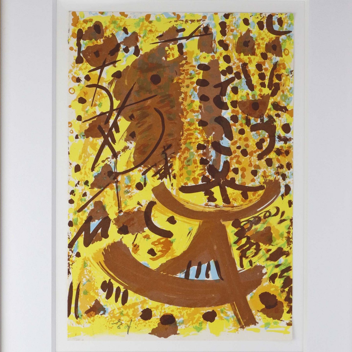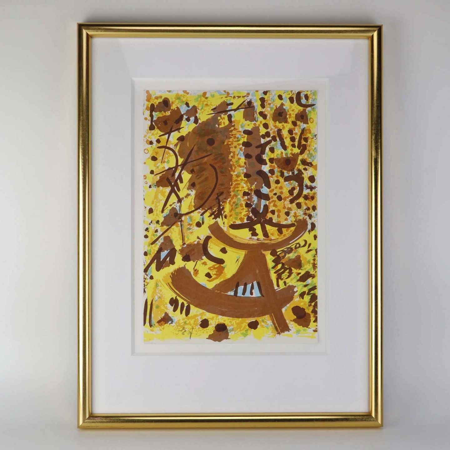 Indrammet litografi med passepartout i guldmalet træramme med abstrakt motiv i gule og brune farver. Litografiet er ikke nummereret.Kunstner Egill Jacobsen (1910-1998)