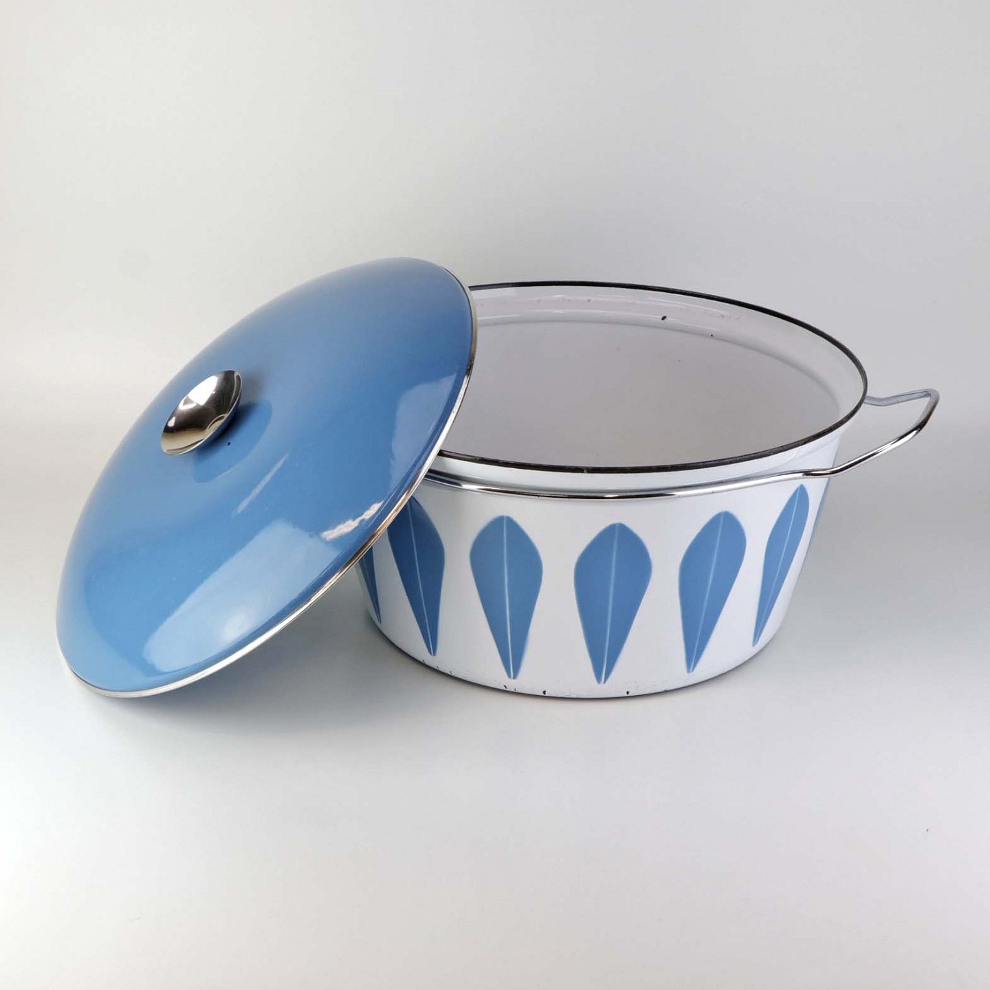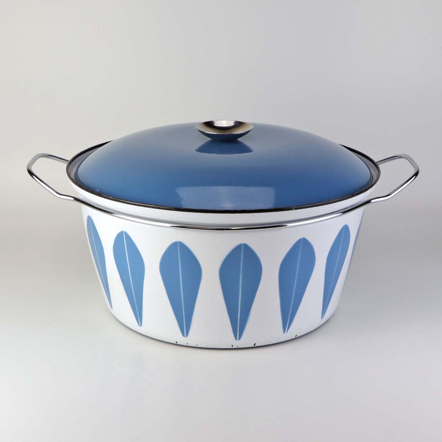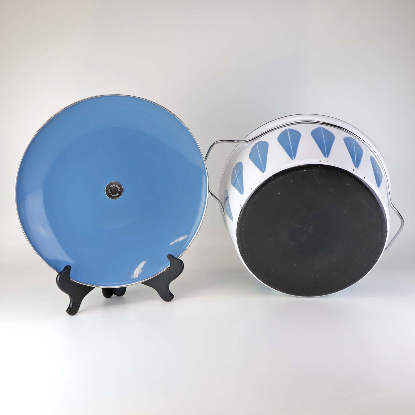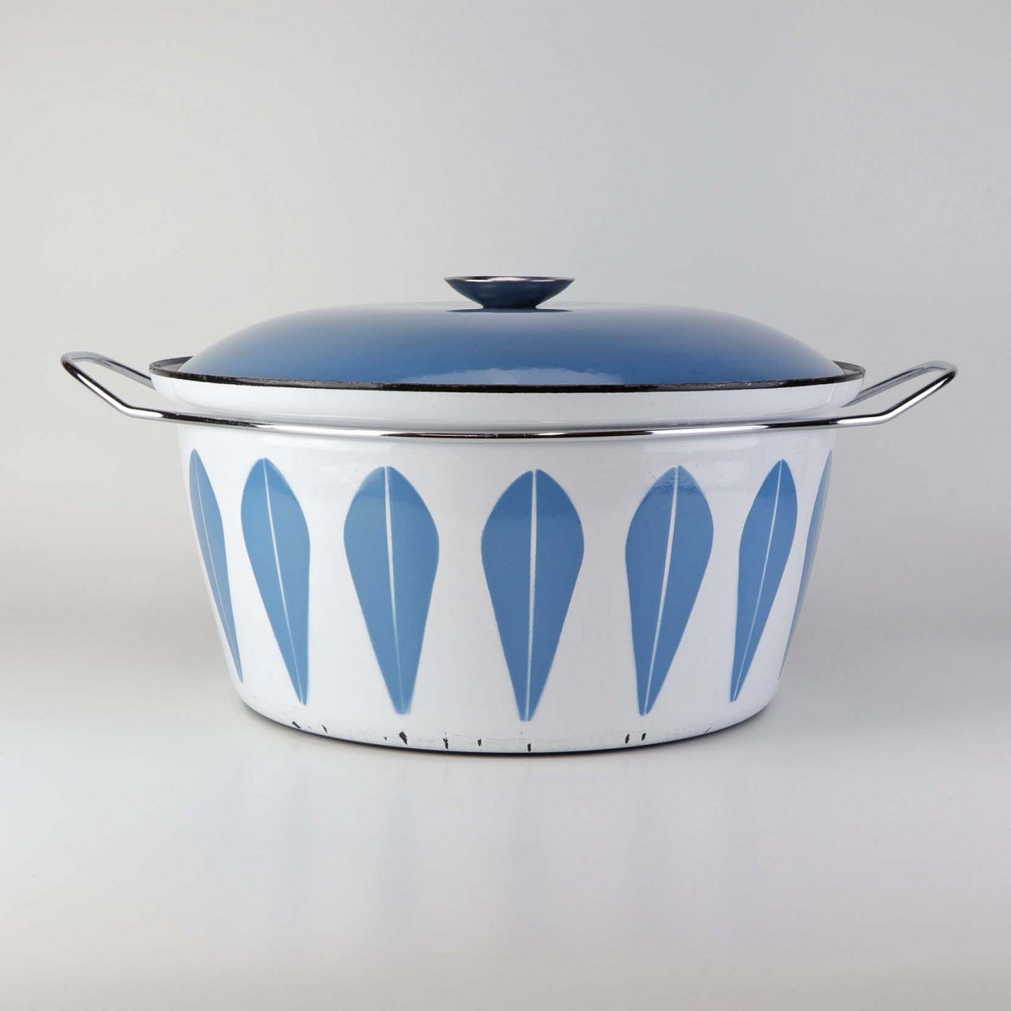 Stor emalje gryde med låg og med blå Lotus motiv. Gryden er fra 1960'erne.Formgiver Grete Prytz Kittelsen