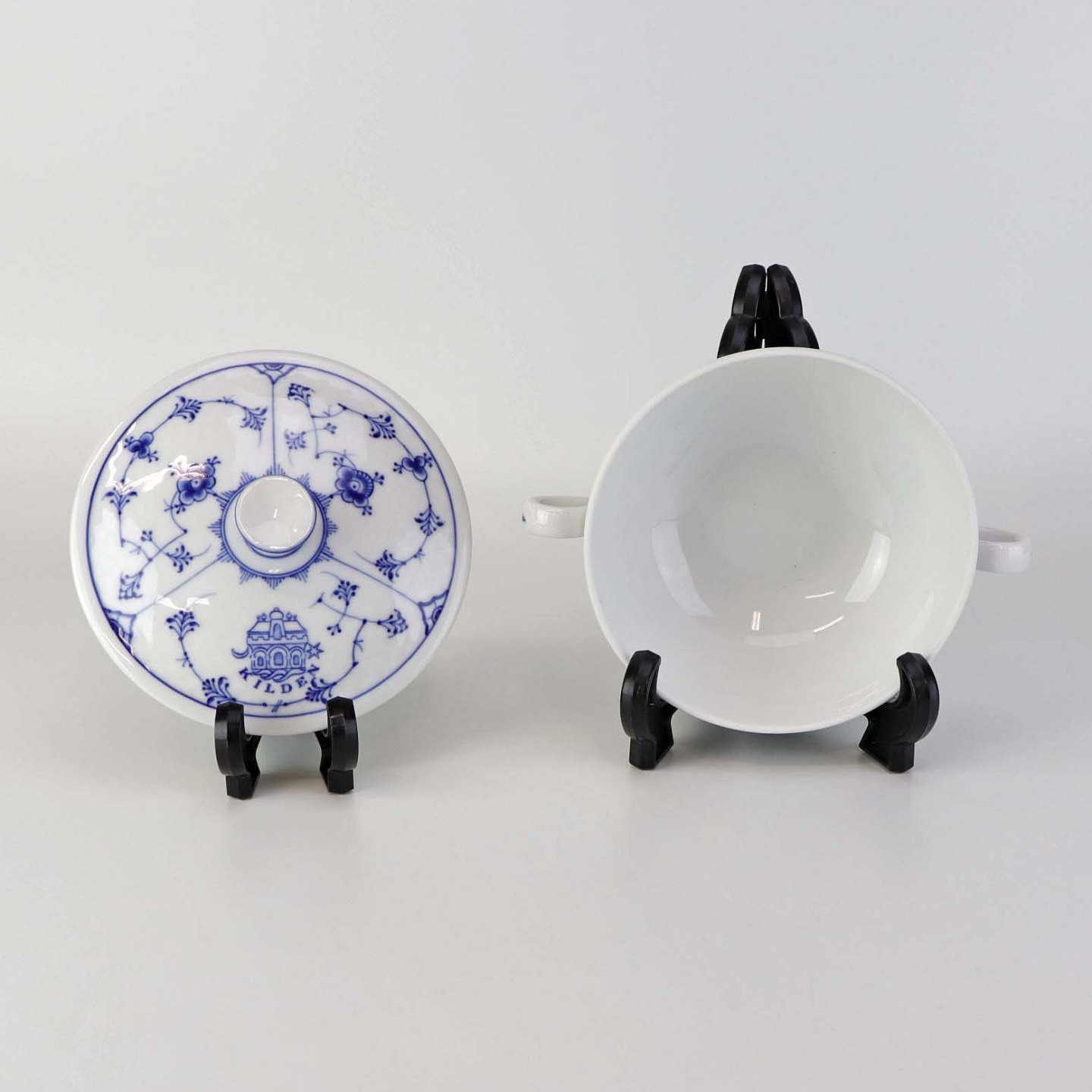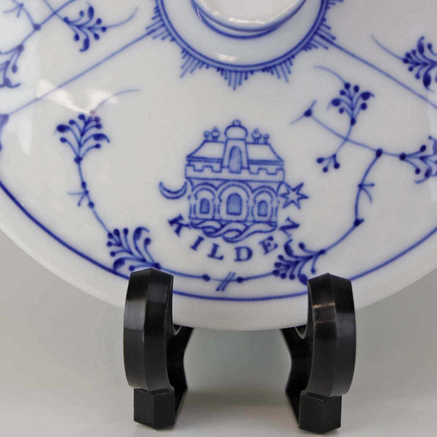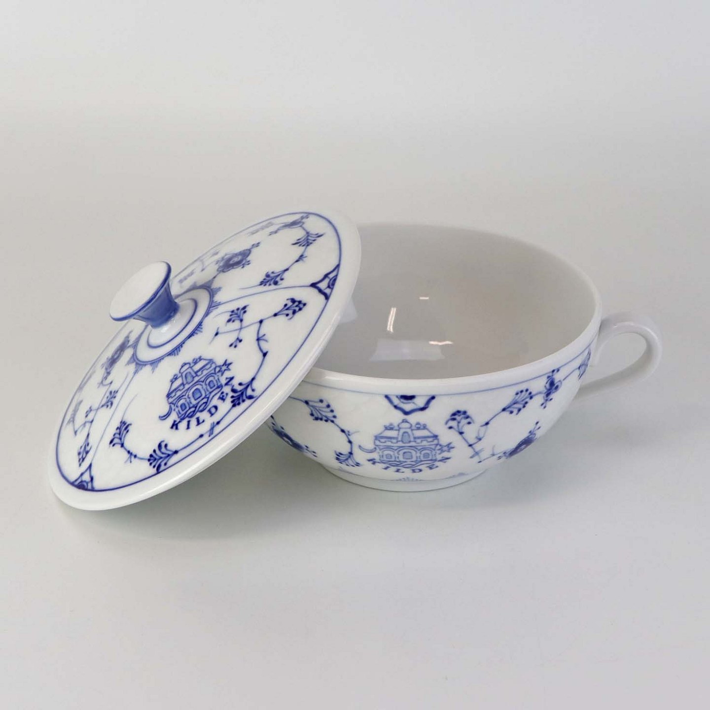 Boullionkop med låg i hotelporcelæn med motiv fra restaurant Kilden i Aalborg fra stellet Blåmalet. Nr. 1029Producent Bing & Grøndahl