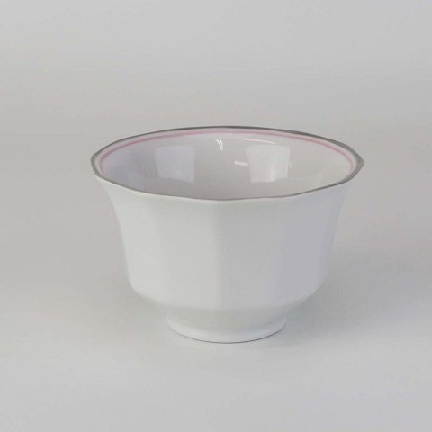 Service i kantet hvidt porcelæn dekoreret med lyserød og grå stribe ved kant.