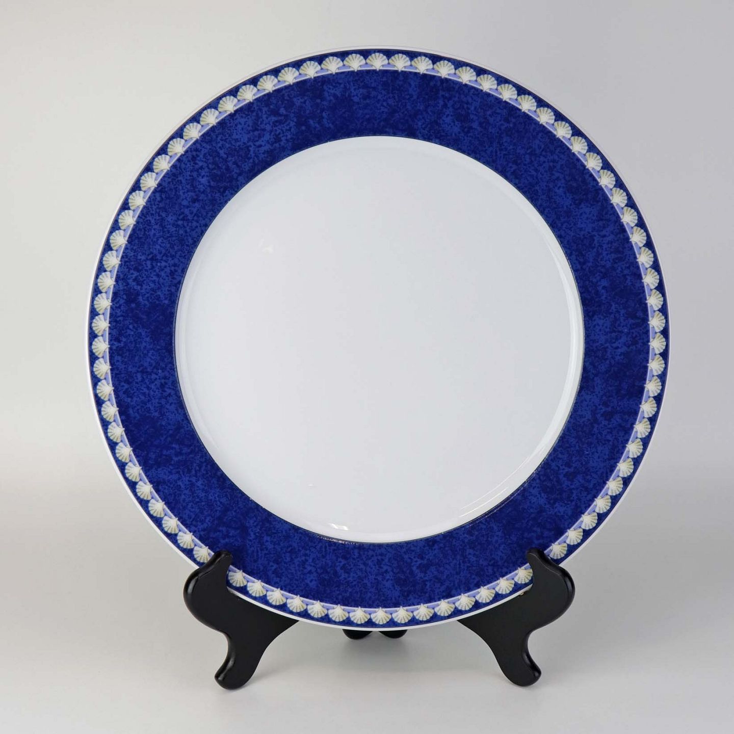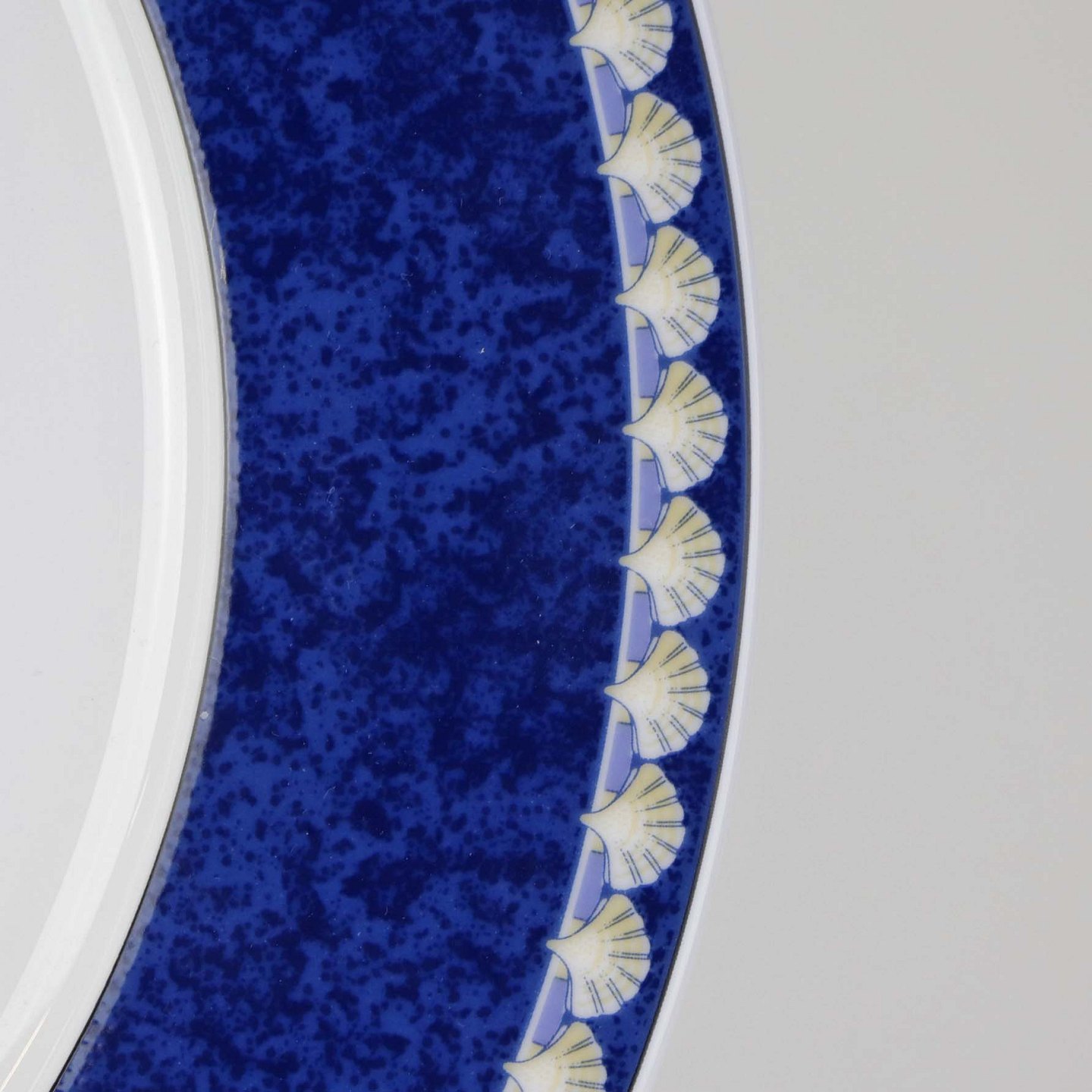 Service i glat hvid porcelæn med blåt bånd og dekoration af gule vifteformede strandskaller. Stellet kan gå i opvaskemaskinen.