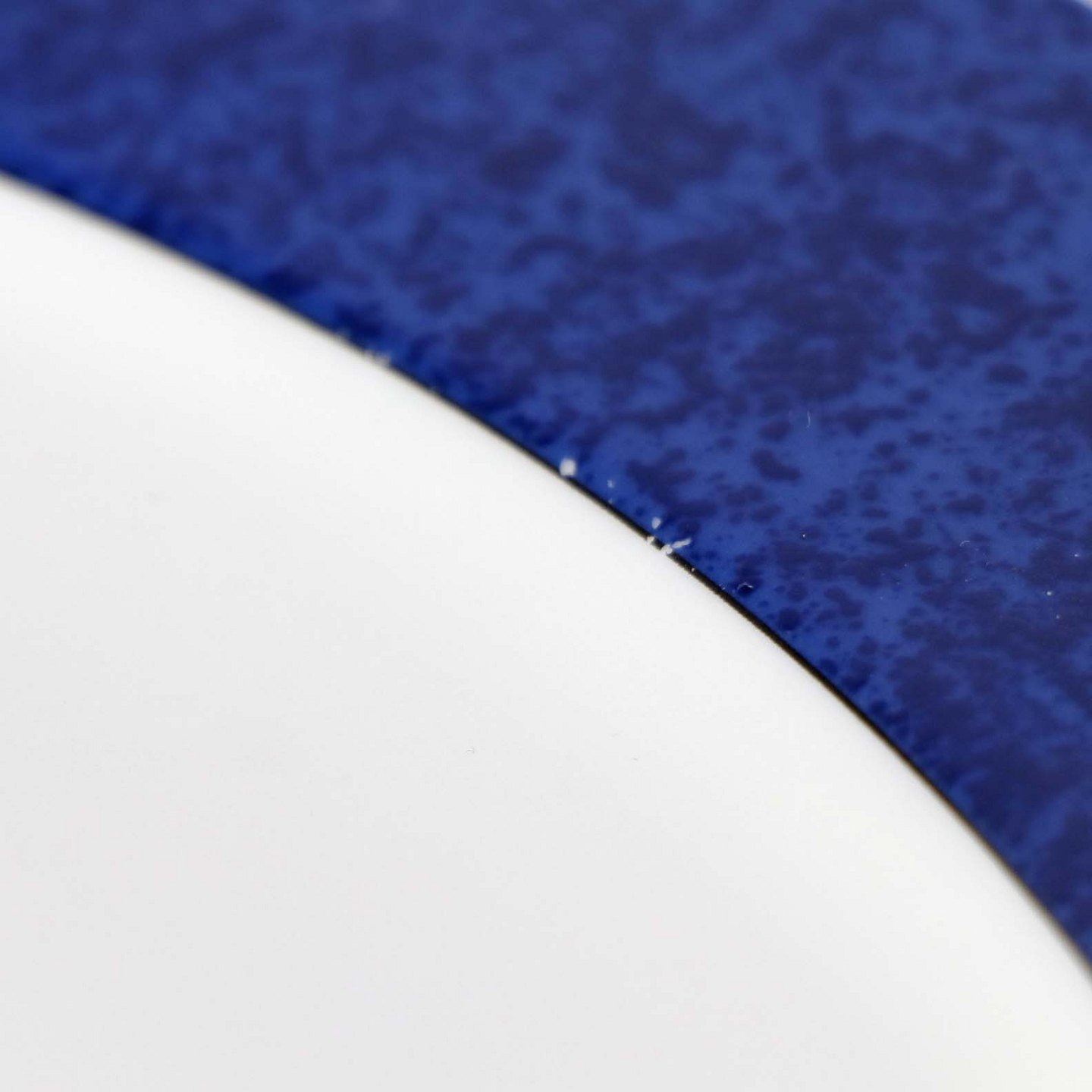 Fremstår med mindre brugsspor på frontsiden ved blå kantbånd.