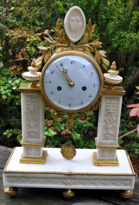 Französische Säulenuhr aus vergoldeter Bronze und weißem Marmor, Empire, ca. 1830. Säulen und Sockel mit Verzierung. Uhrengehäuse mit Blattwerk aus vergoldeter Bronze verziert. Marmorplatte mit zwei brennenden Herzen. Standarduhrwerk mit Glocke. Zifferblatt aus weißem Email mit arabischen Ziffern. Mit Pendel mit Sonne. H. cm. B.: 31 cm. T.: 12 cm. : 43Bestellnummer: 28243