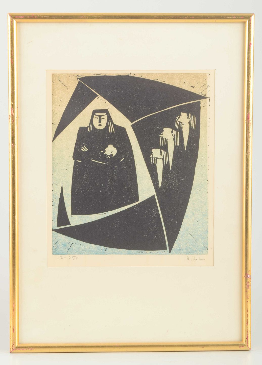 Et karakteristisk træsnit af den svenske keramiker og billedkunstner Åke Holm, udført i hans særlige ekspressive stil med bibelsk motiv.