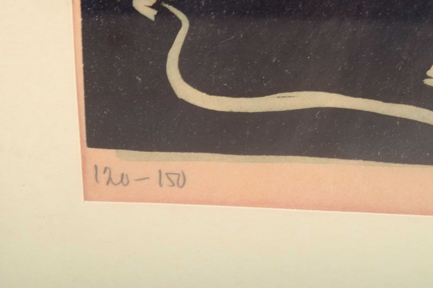 Et karakteristisk træsnit af keramikeren og billedkunstneren Åke Holm, der med sine ekspressive sort-hvide tryk ofte skildrede bibelske og mytologiske temaer.