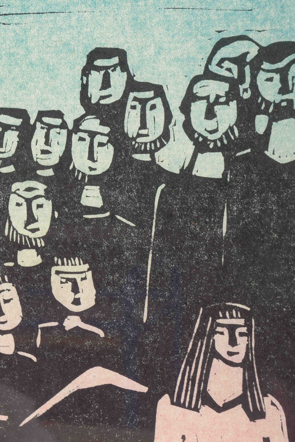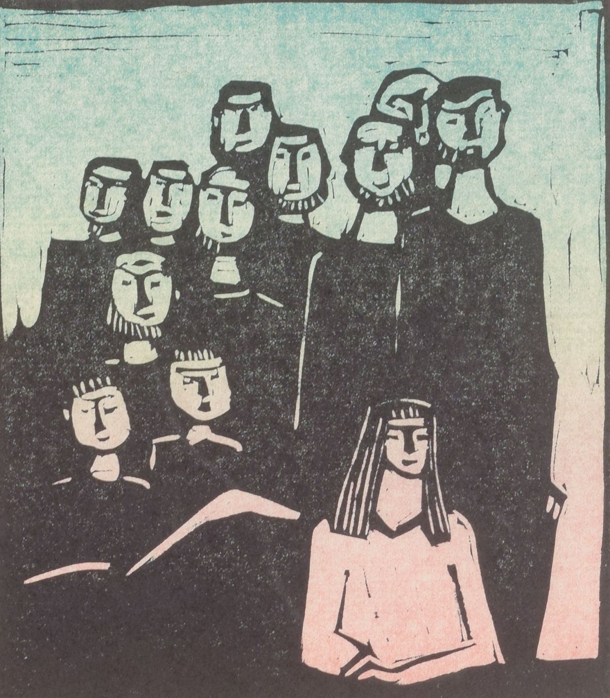 Et karakteristisk grafisk blad af svenske Åke Holm, kendt for sine stærkt stiliserede figurfremstillinger med klare konturer og enkle, monumentale udtryk.