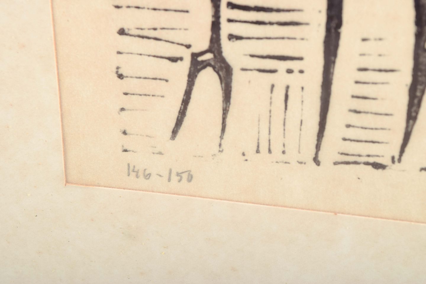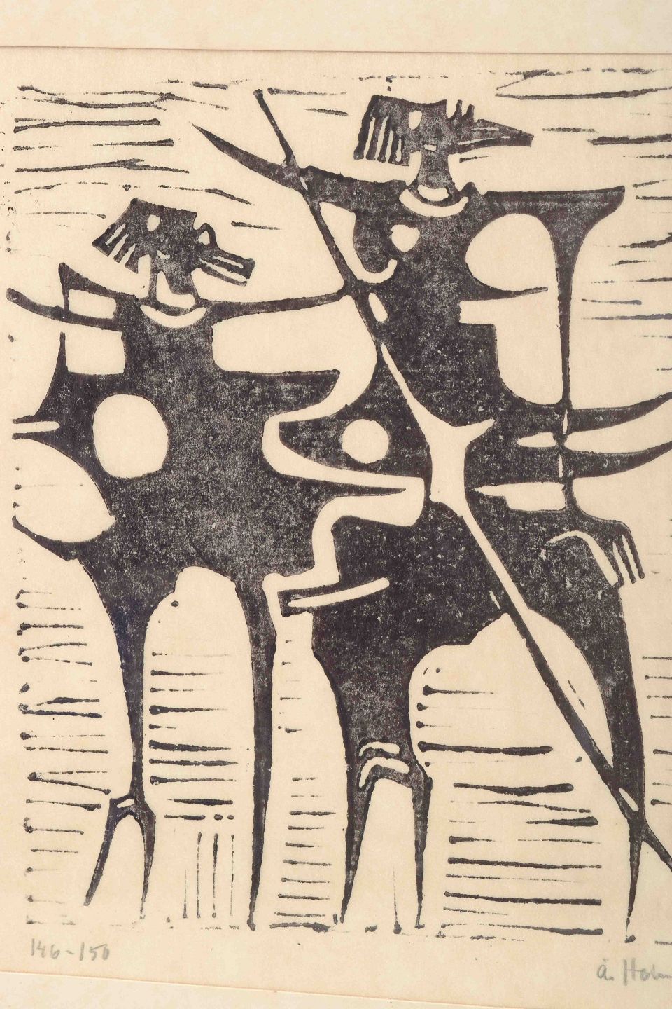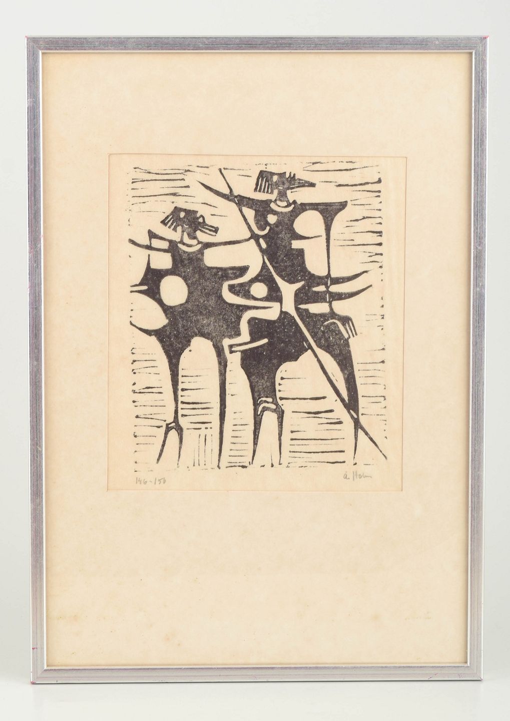 Et karakteristisk grafisk blad af den svenske billedhugger og keramiker Åke Holm, der især er kendt for sine ekspressive keramikfigurer og grafiske arbejder med bibelske og abstrakte motiver.