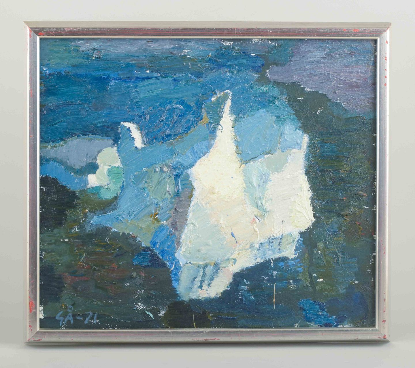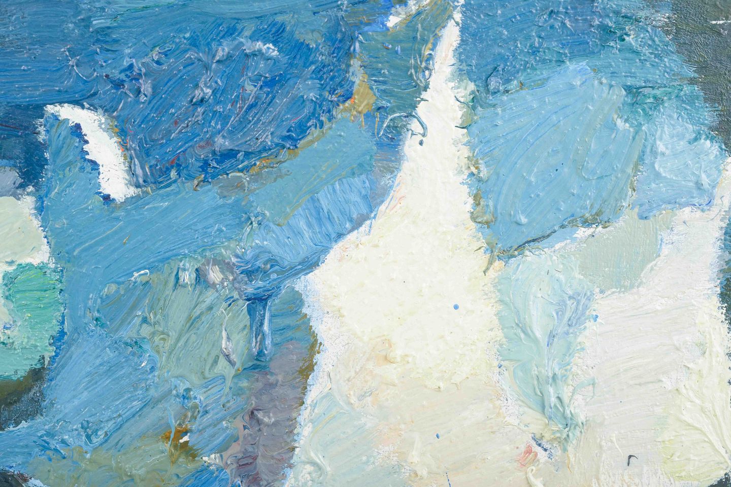 Et ekspressivt værk af en skandinavisk kunstner, udført i kraftige penselstrøg og dybe blå og hvide toner. Maleriet bærer tydeligt præg af en modernistisk tilgang med fokus på farvens stoflighed og en næsten landskabelig association.
