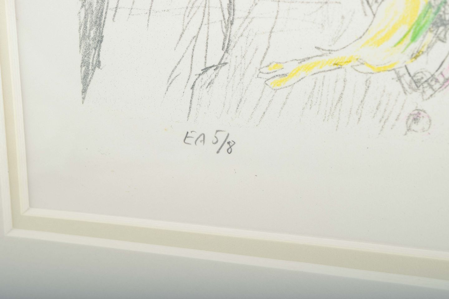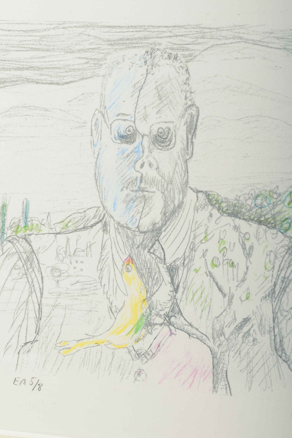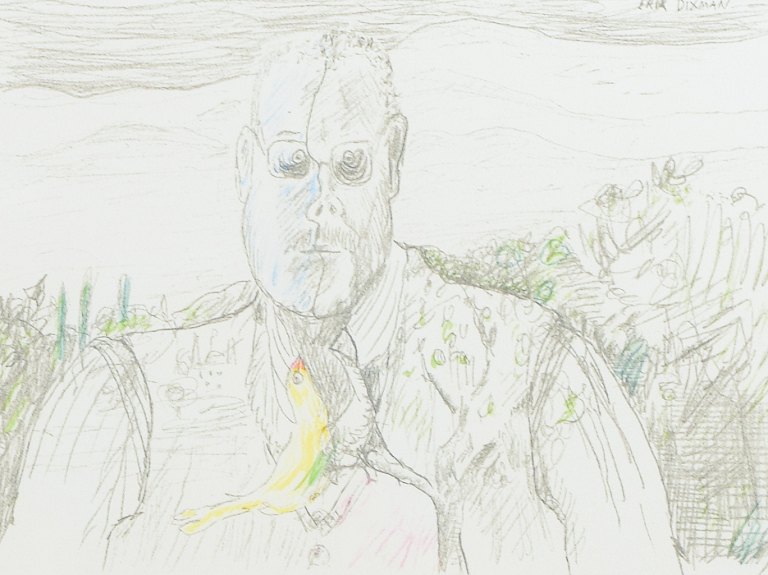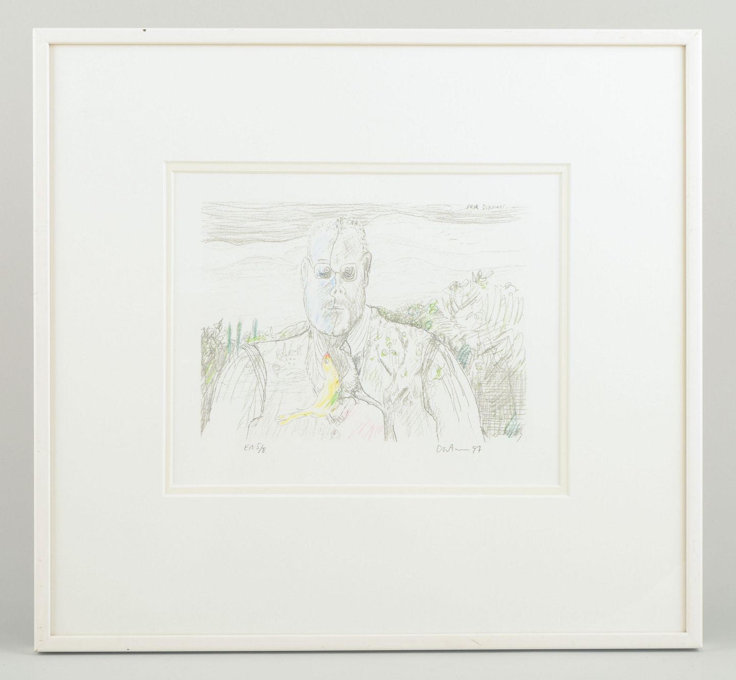 Et ekspressivt litografi af Erik Dietman, udført i 1997. Motivet viser et mandsportræt i blyant med farvelagte detaljer, blandt andet en gul fugl, der tilfører værket et poetisk og humoristisk præg.