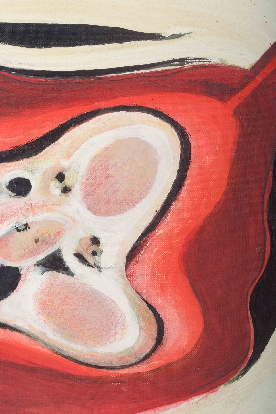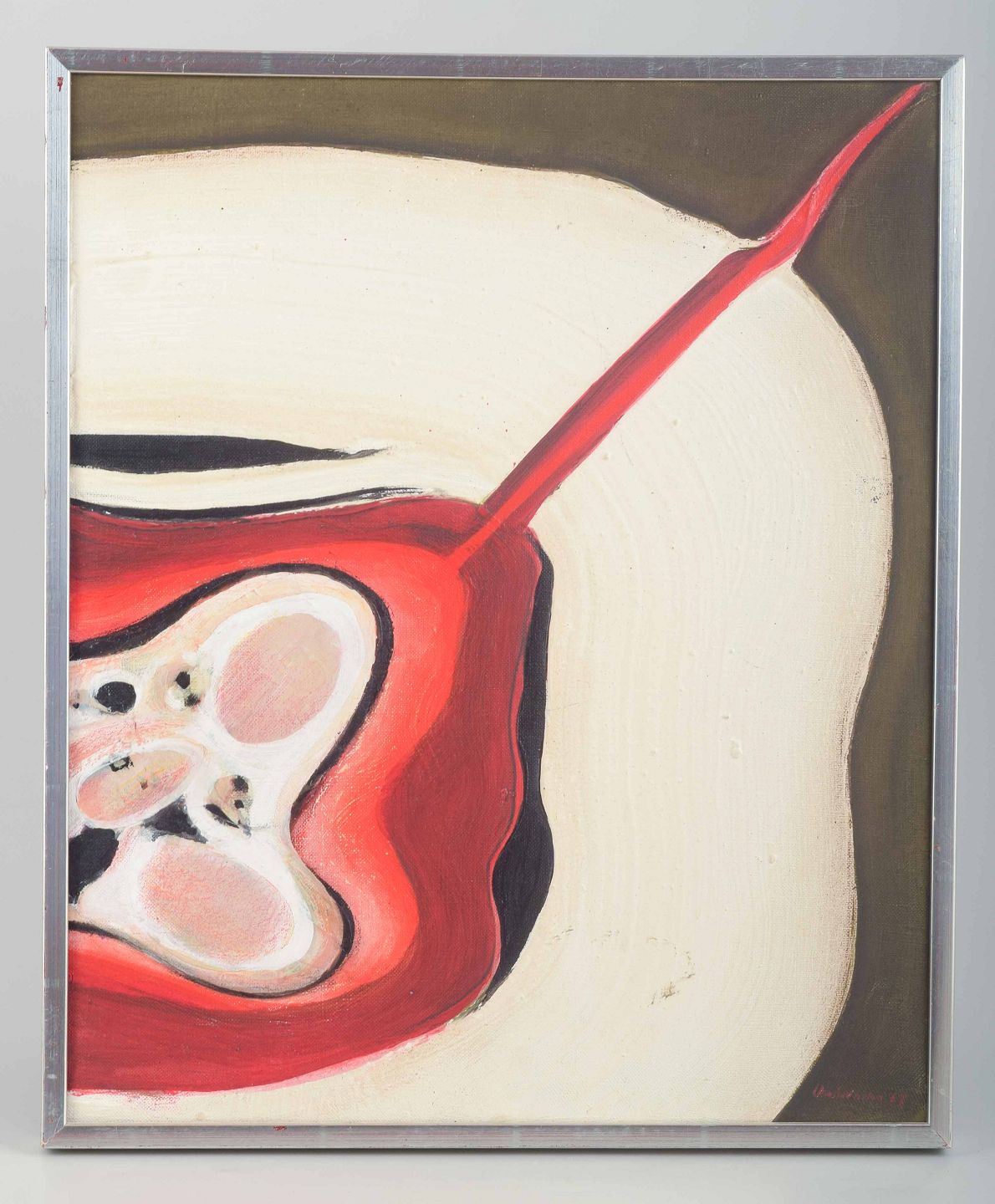 Et modernistisk værk af den svenske kunstner Uno Svensson, signeret og dateret 1967. Maleriet viser en stærk koloristisk komposition med røde og hvide organiske former mod en neutral baggrund, præget af kunstnerens karakteristiske sans for bevægelse og kontrast.