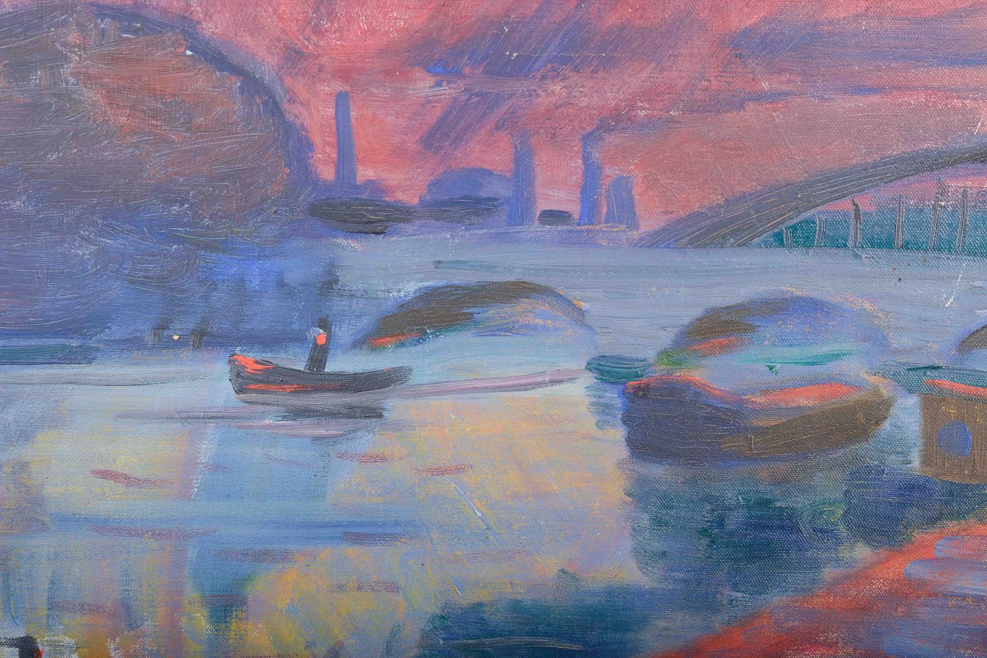 An atmospheric view of the river La Seine in Paris by Gerhard Lundberg, painted in 1938 with expressive brushstrokes and strong colors.