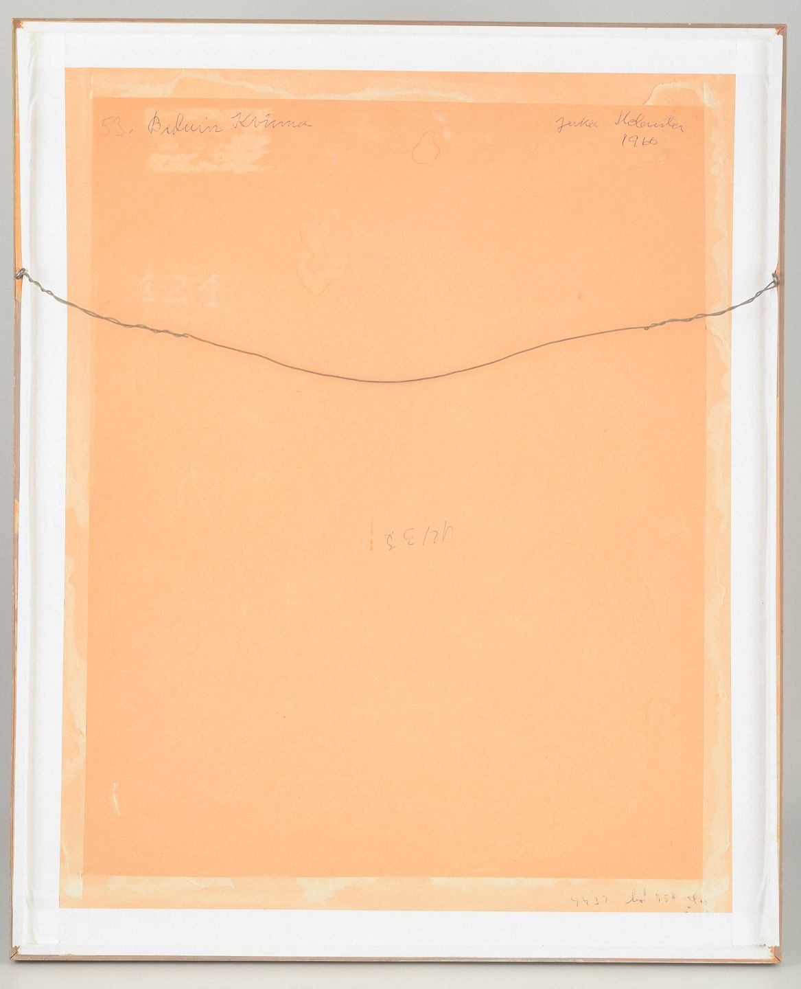 Et tidligt værk af Jerker Helander fra 1966, udført i gouache med brede, ekspressive penselstrøg i blå, grå og hvide toner. Kompositionen fremstår som en abstraheret figur, hvor kontrasten mellem de kølige farver og de varme gyldne felter skaber en intens, nærmest ikonisk tilstedeværelse.