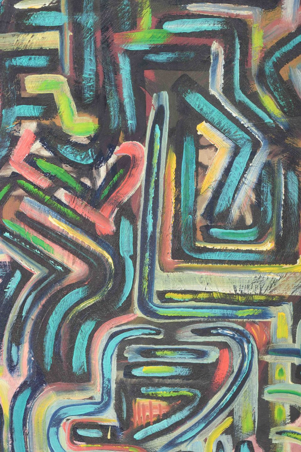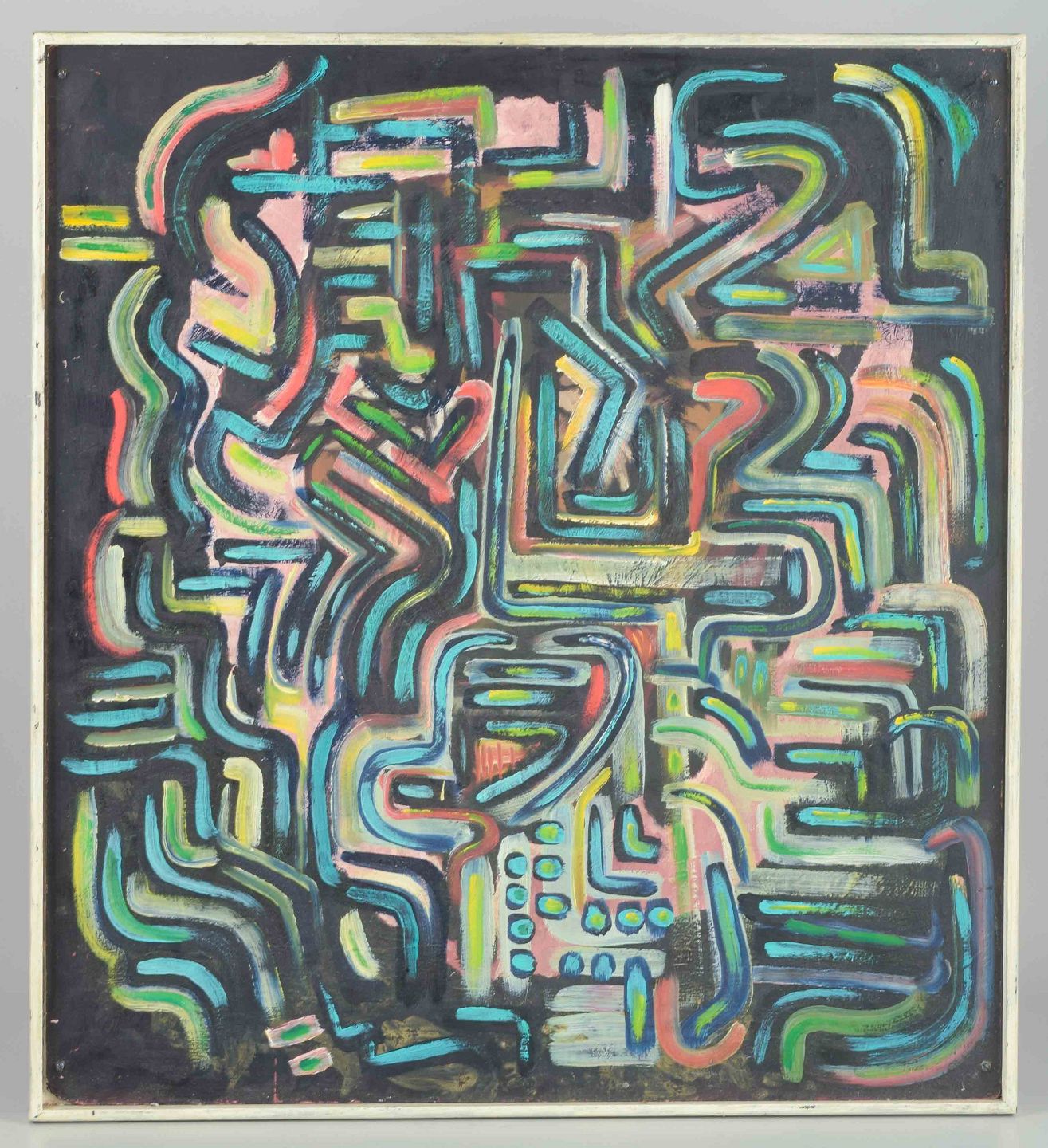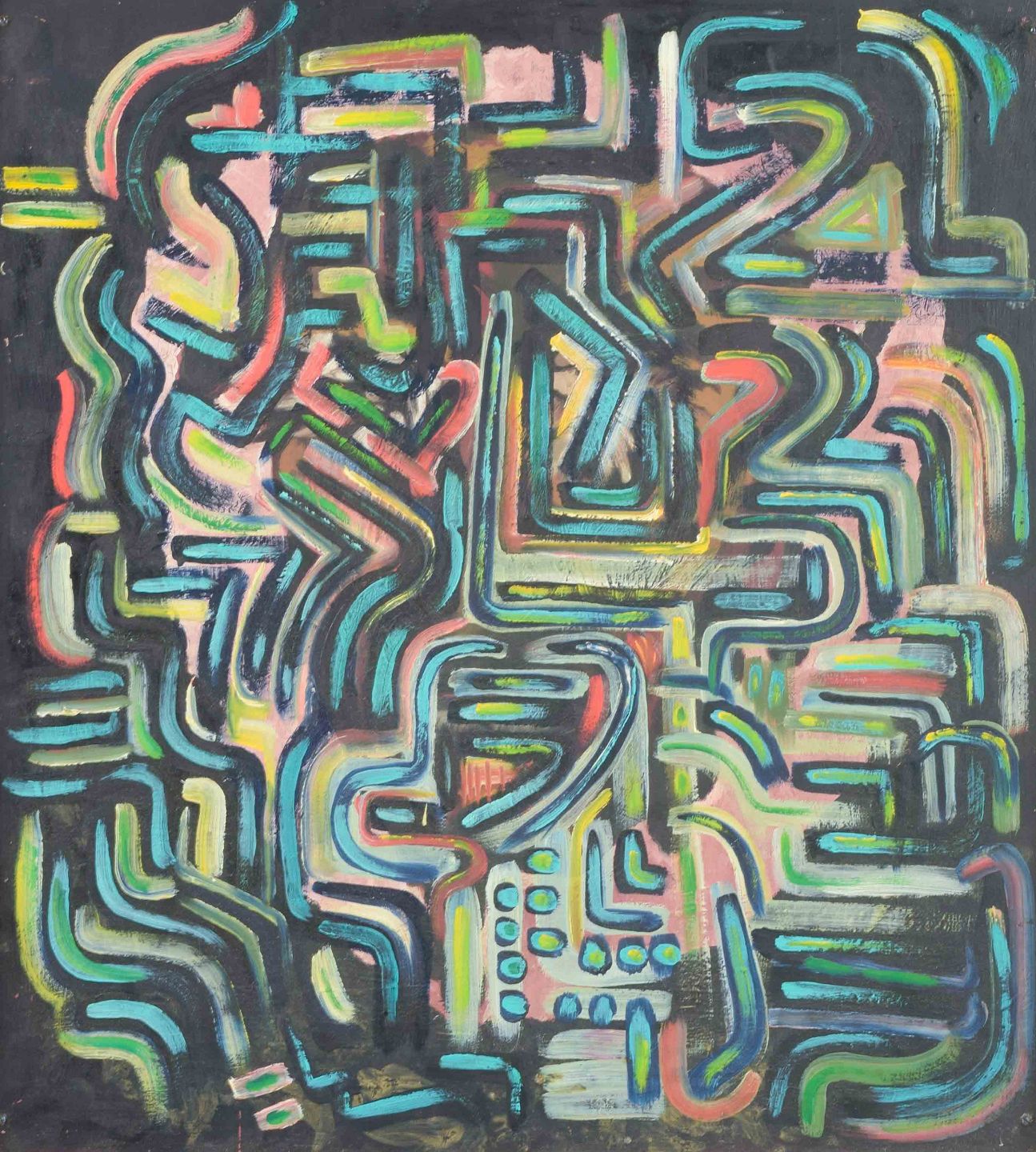 Et ekspressivt værk af Carsten Hellström, hvor organiske og geometriske former smelter sammen i et levende mønster. De turkis, grønne, rosa og gule toner står i dynamisk kontrast til den mørke baggrund, hvilket giver maleriet et rytmisk og næsten musikalsk udtryk.