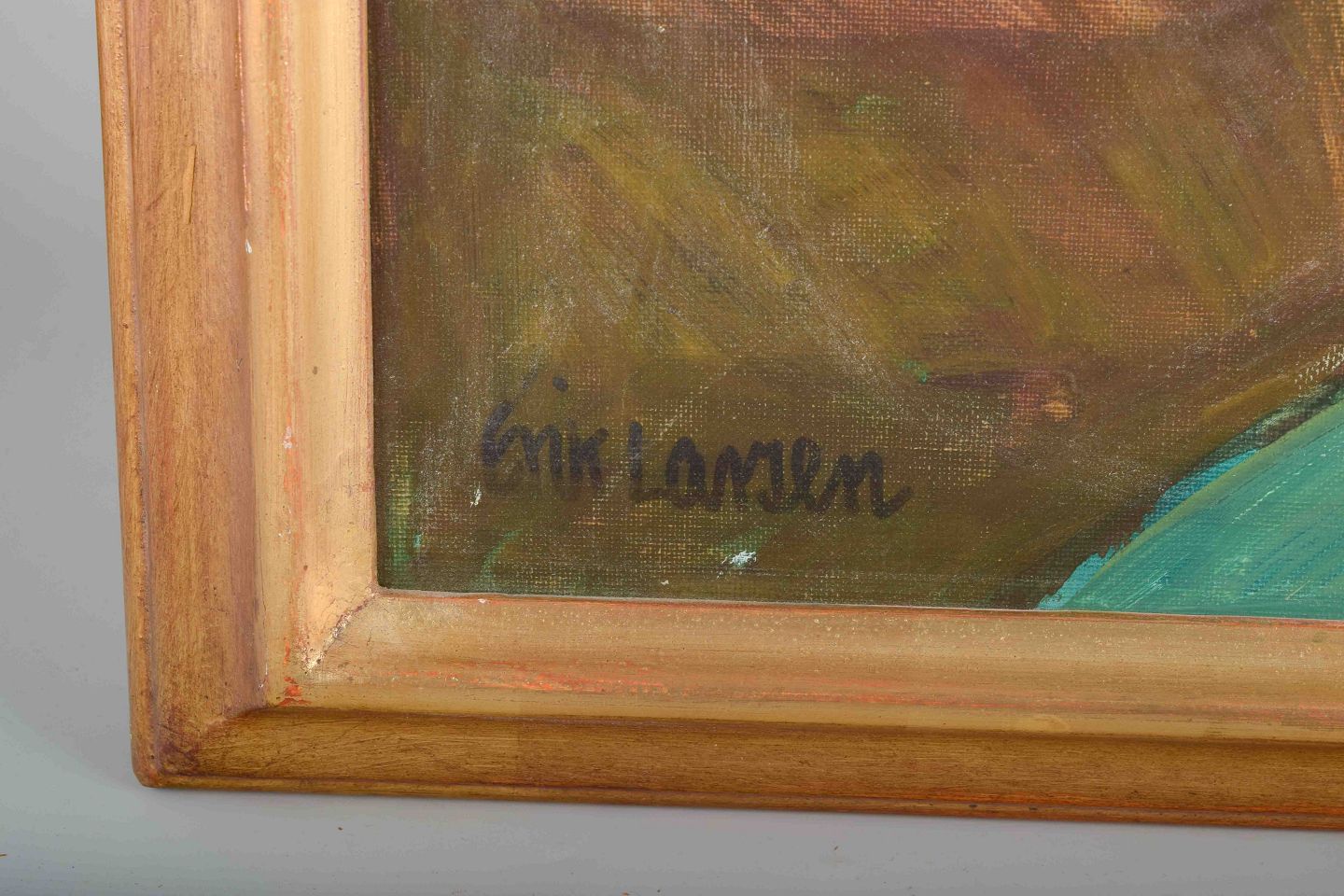 Erik Larsen (dansk maler, aktiv i 1900-tallet) er kendt for sine ekspressive og koloristiske værker, hvor figurer og stemninger skildres med en rå, næsten naivistisk energi. Hans værker bærer ofte præg af en umiddelbarhed og intens brug af farve, hvilket gør dem iøjnefaldende og karakteristiske i dansk kunsthistorie.