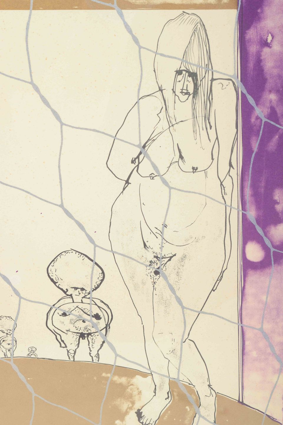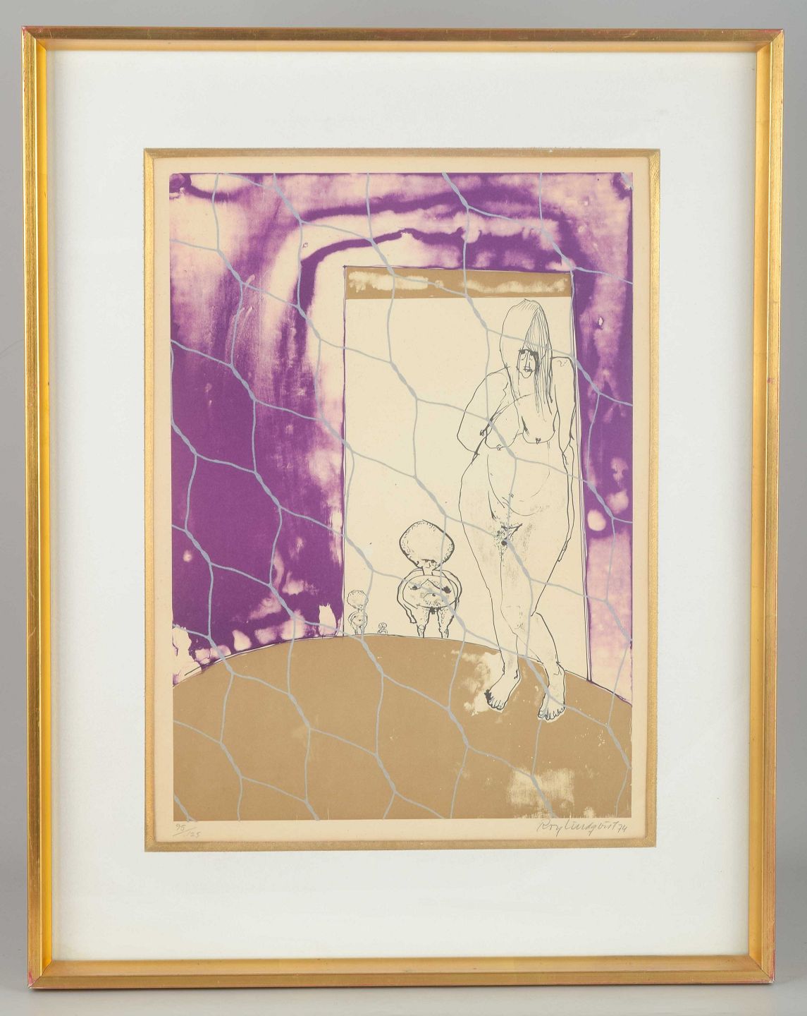 Et ekspressivt litografi af Roy Lindqvist, udført i et stiliseret formsprog med grafiske konturer, stærke kontraster og farvefelter i violet og okker. Værket viser en figurkomposition med både humor og social kommentar.