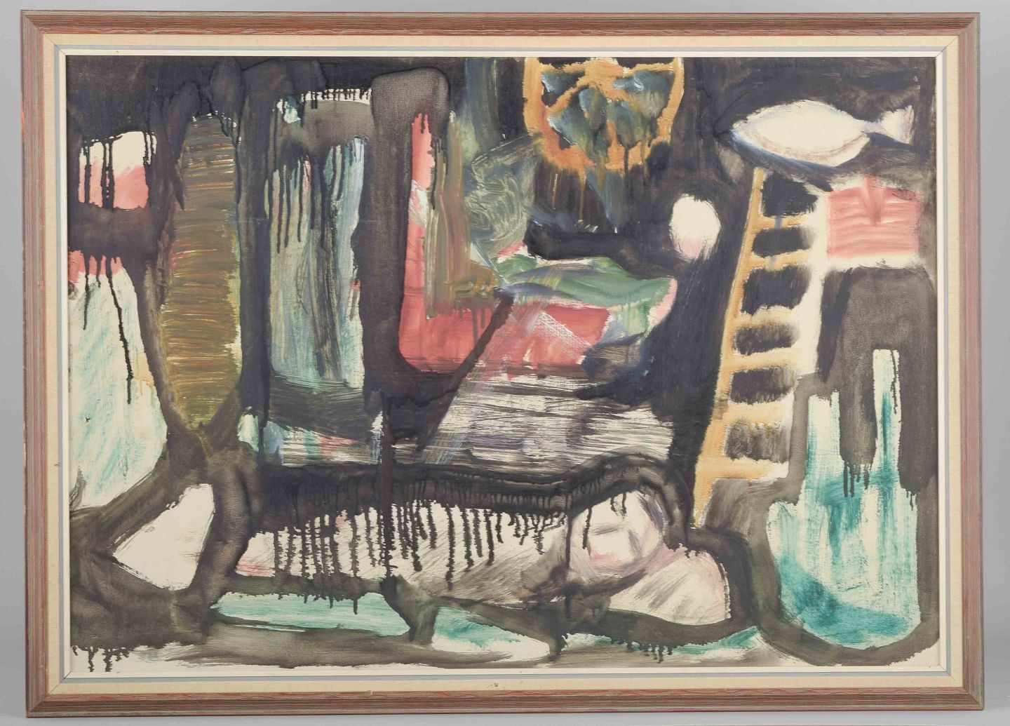 This expressive work emerges as a striking manifestation of the post-war Scandinavian modernist idiom, in which spontaneous brushstrokes, fluid contours, and contrasting chromatic fields generate a visual dynamism that simultaneously suggests an inner psychological intensity and a conscious emancipation from naturalistic tradition. The dripping black lines accentuate the dramatic tenor of the composition, underscoring its dual character as both improvisational gesture and carefully considered artistic statement.