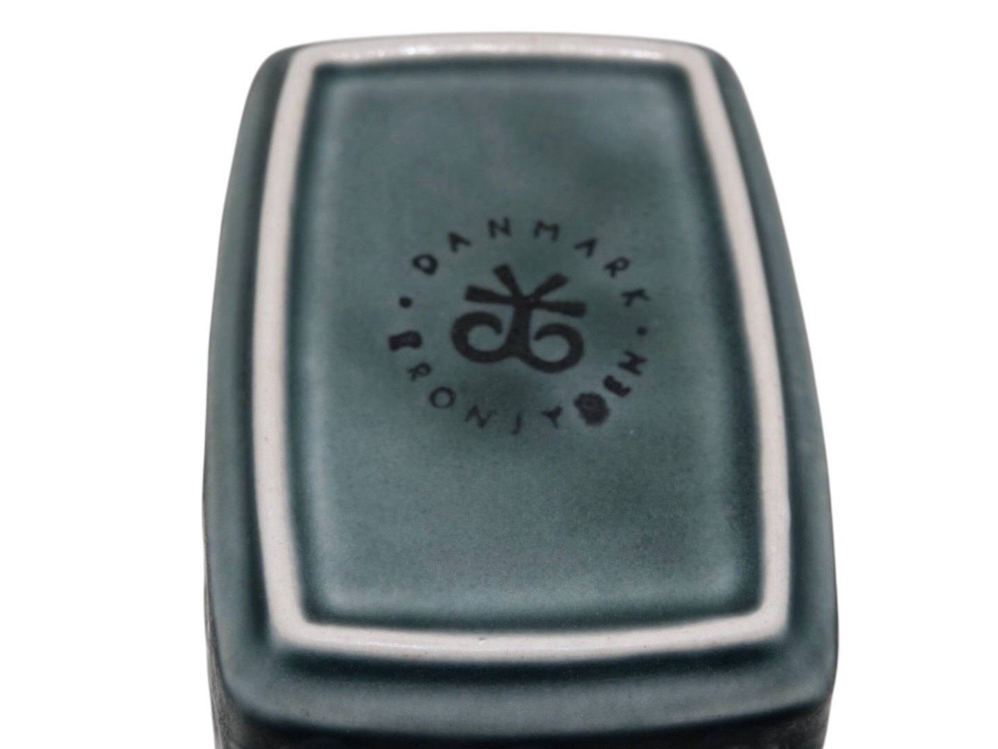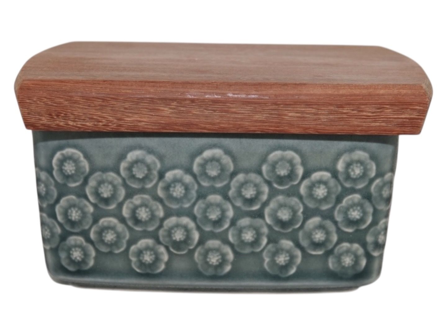 Kronjyden Grøn Azur stentøj, smørskål med trælåg.Designet af Jens Harald Quistgaard.