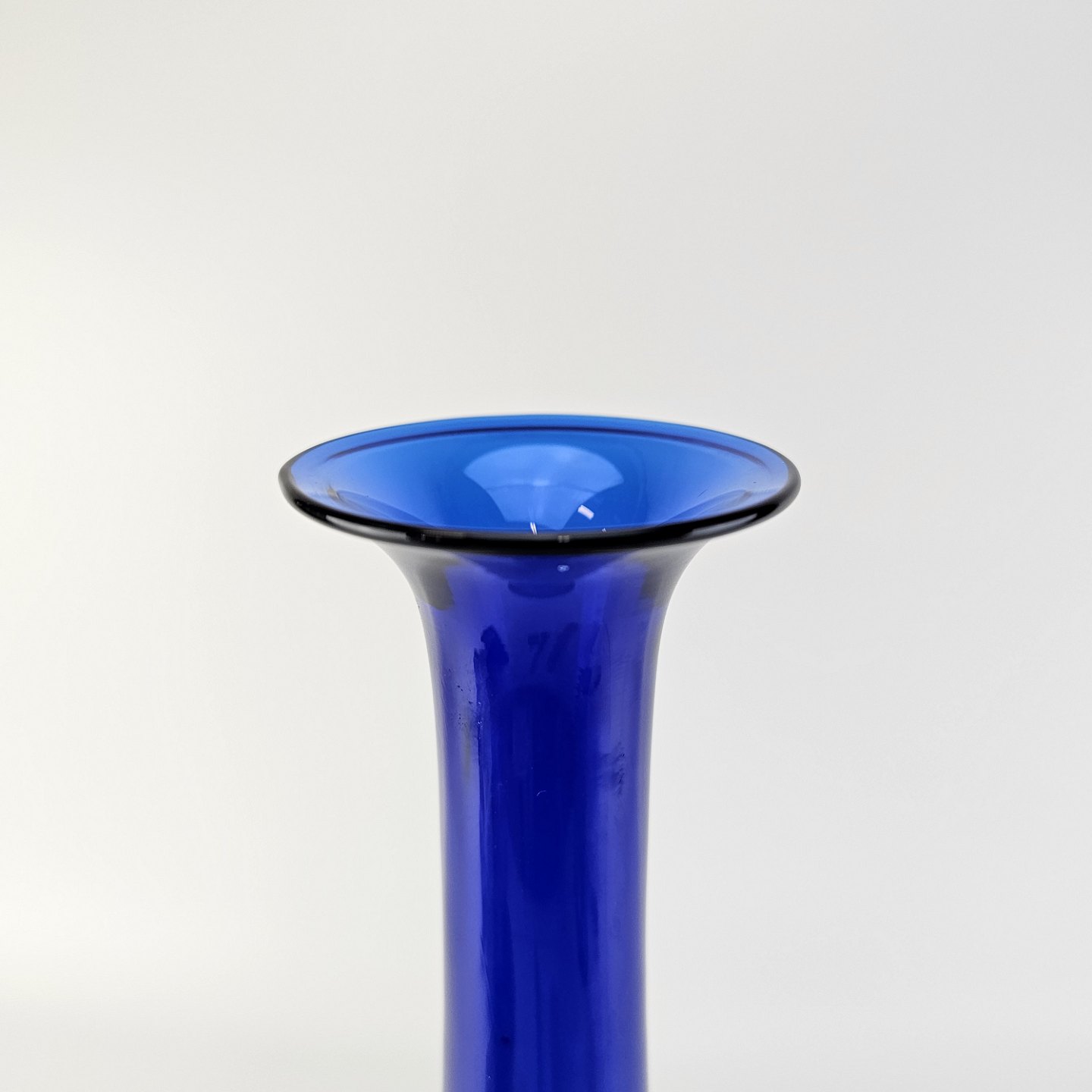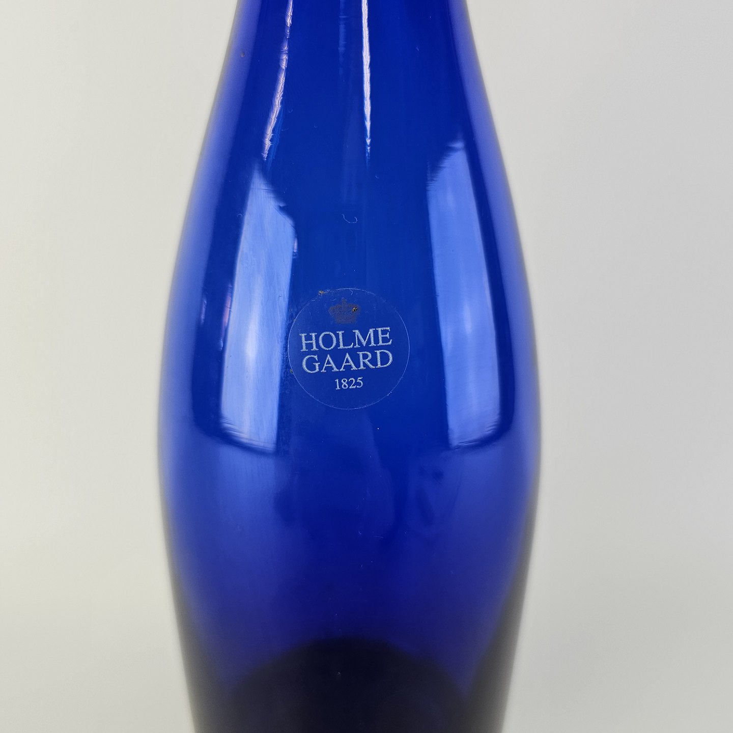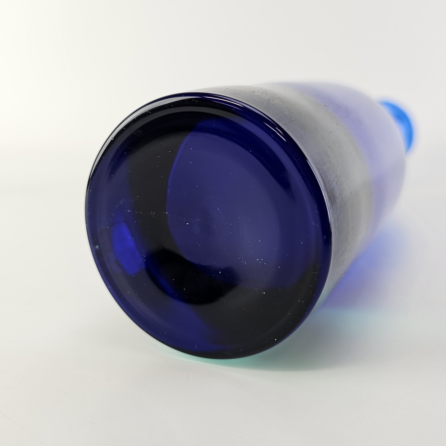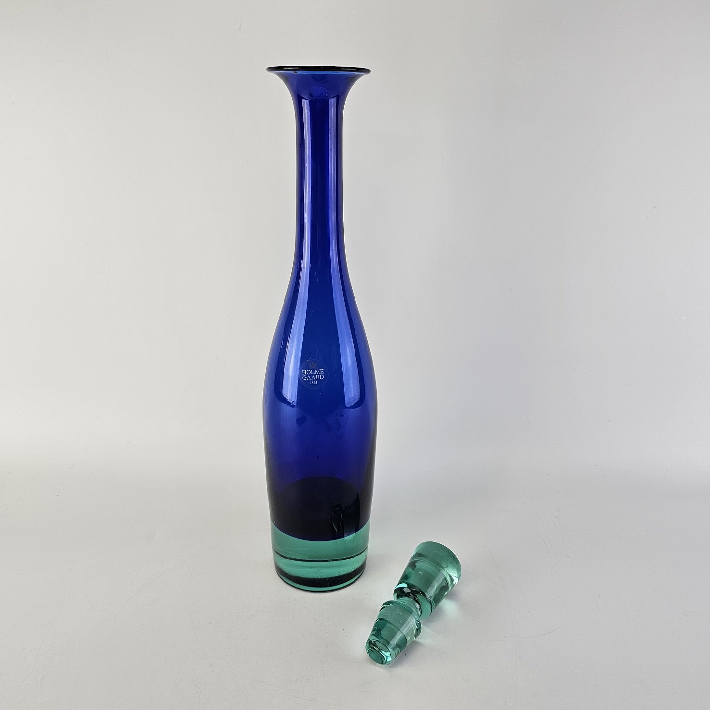 Flaske med prop af blåt klart glas, bund og prop i lysere glas fra serien Harlekin.Producent Holmegaard