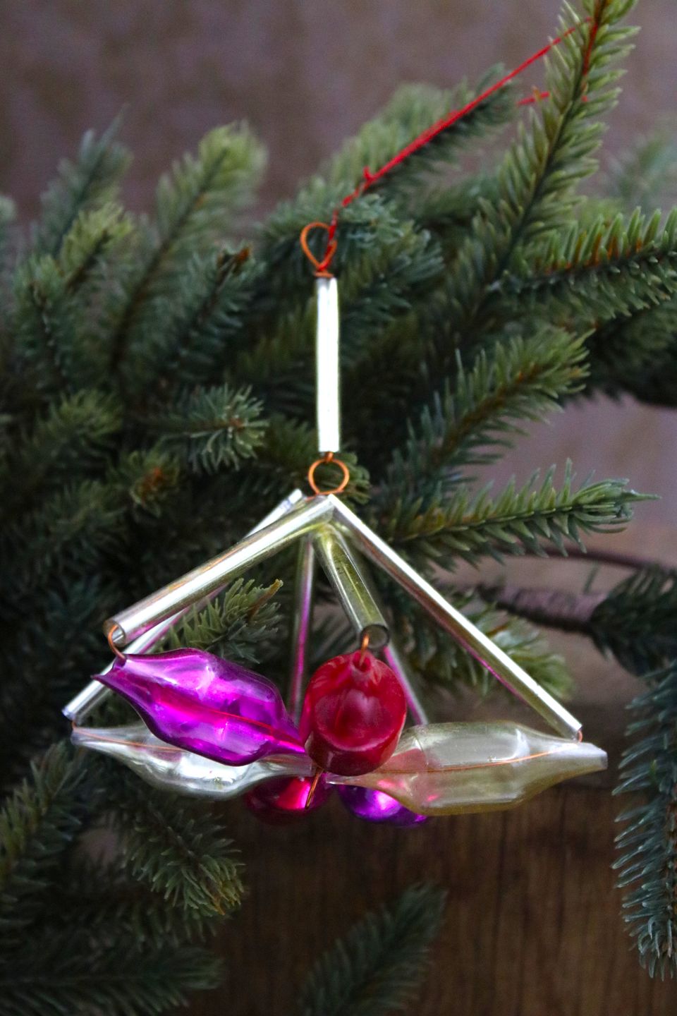 Gammelt juletræspynt i form af farvet glas pynt fra omkring 1940...