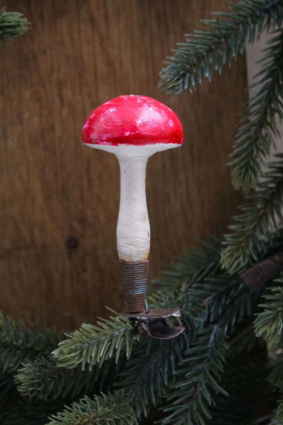 Gammelt juletræspynt i form af padehat i vat/papir med klemme.