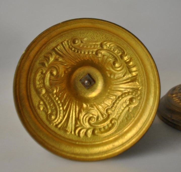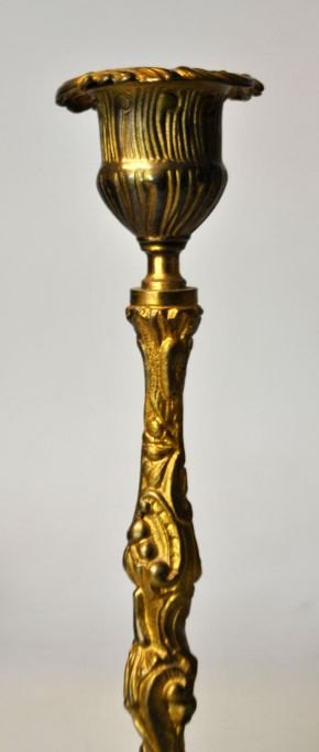 Paar französische Kerzenleuchter, 19. Jahrhundert. Mit Blumen- und Schnörkeldekor. Auf rundem Sockel. H: 20 cm. Durchmesser: 9,5 cm.Bestellnummer: 28255