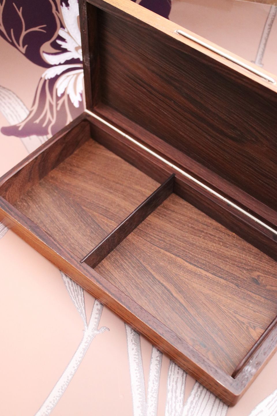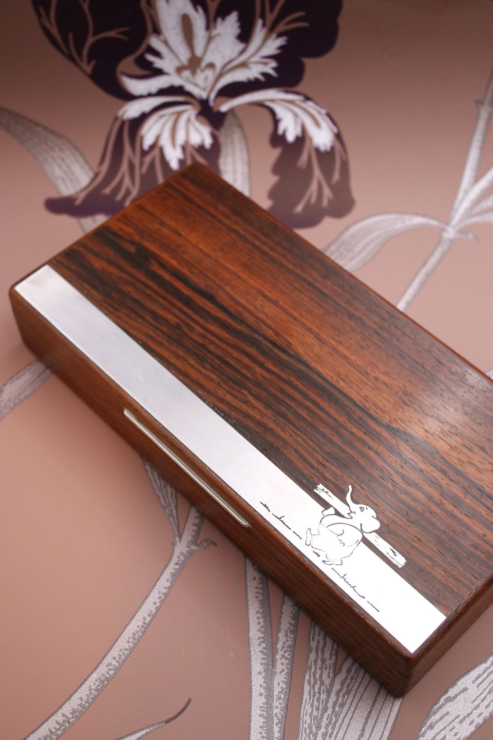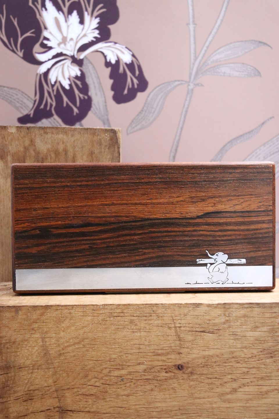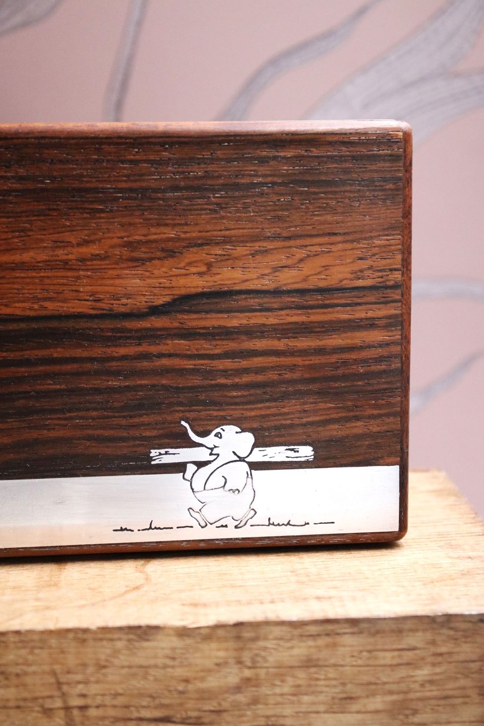 Oblong box in rosewood decorated with silver inlay with a motif of a small elephant carrying a tree trunk on its back.H: 4.3cm. L: 24.5cm. W: 12cm.