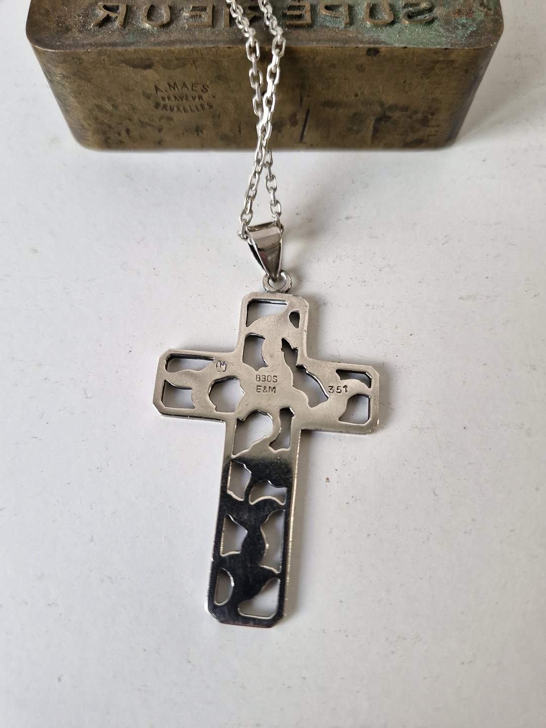 Sølvhalskæde med stort sølv kors. Korset er dekoreret med blomster og designet af Eiler & Marløe.Stemplet: 830s - E&M - 351