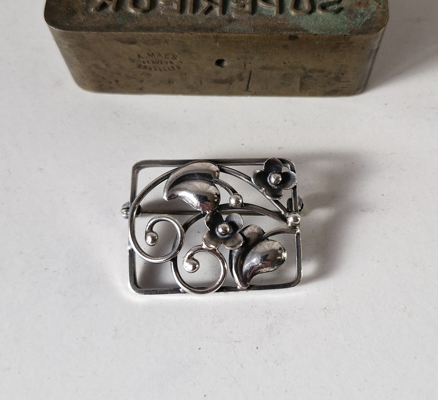 Broche i sølv dekoreret med blomster