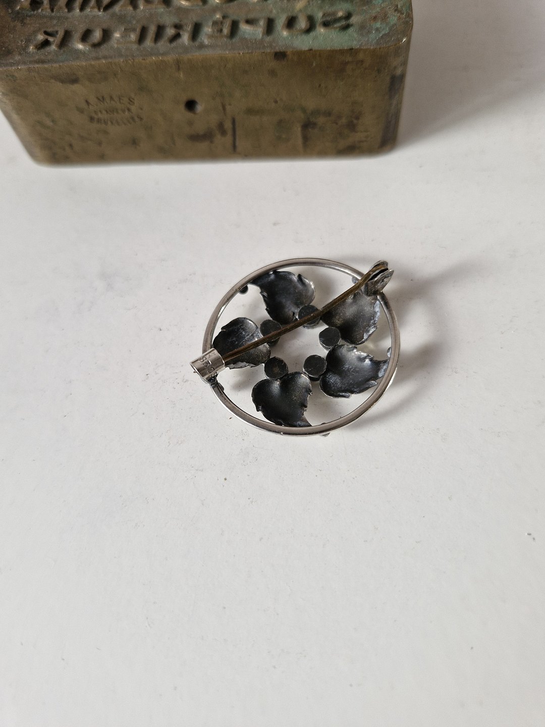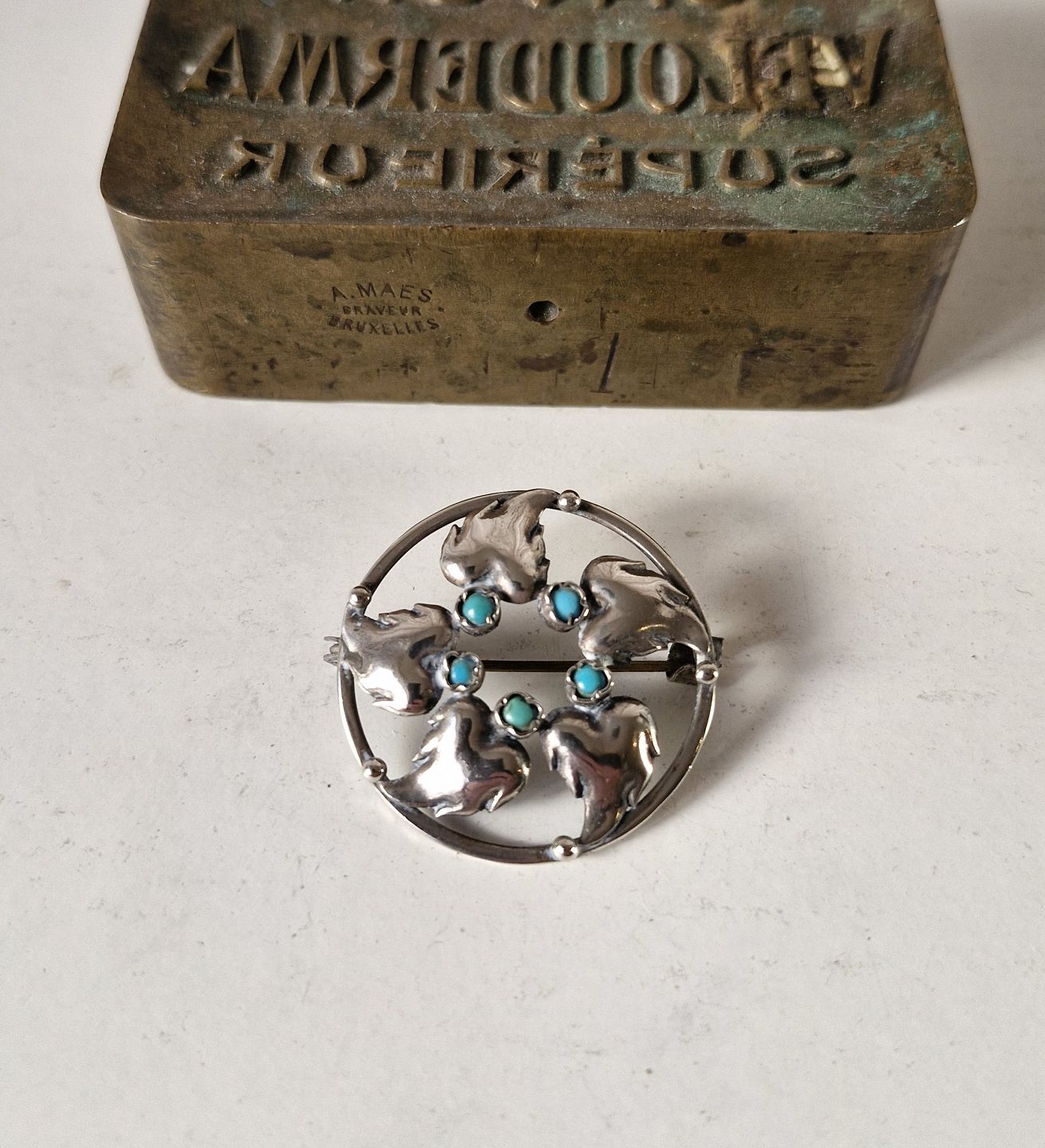 Smuk gammel sølvbroche med turkiser