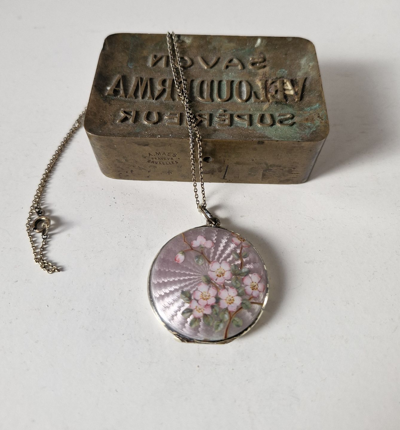 Smuk svensk medaljon med kæde i forgyldt sølv og lyslilla/lyserød emalje dekoreret med kirsebærblomster