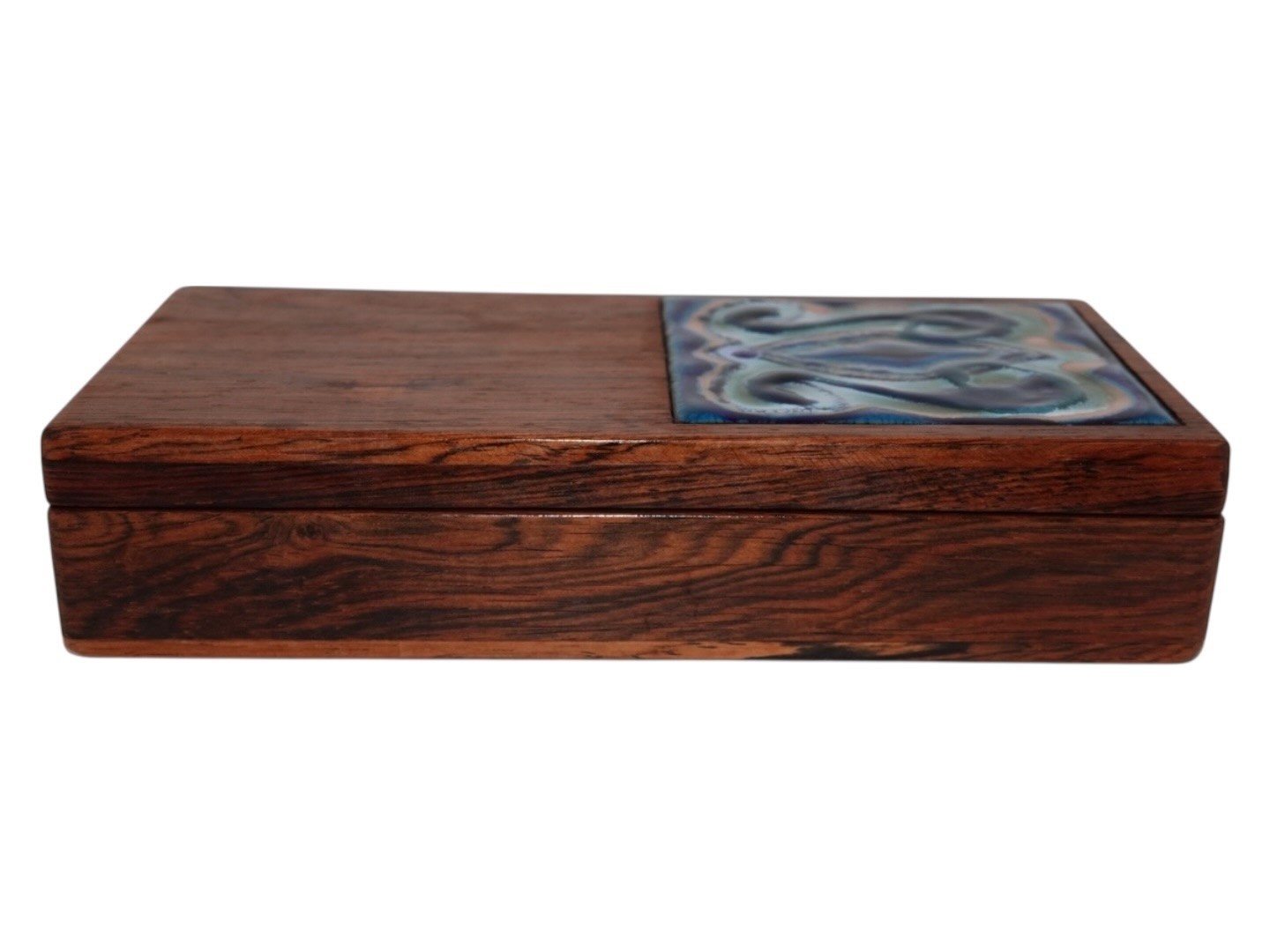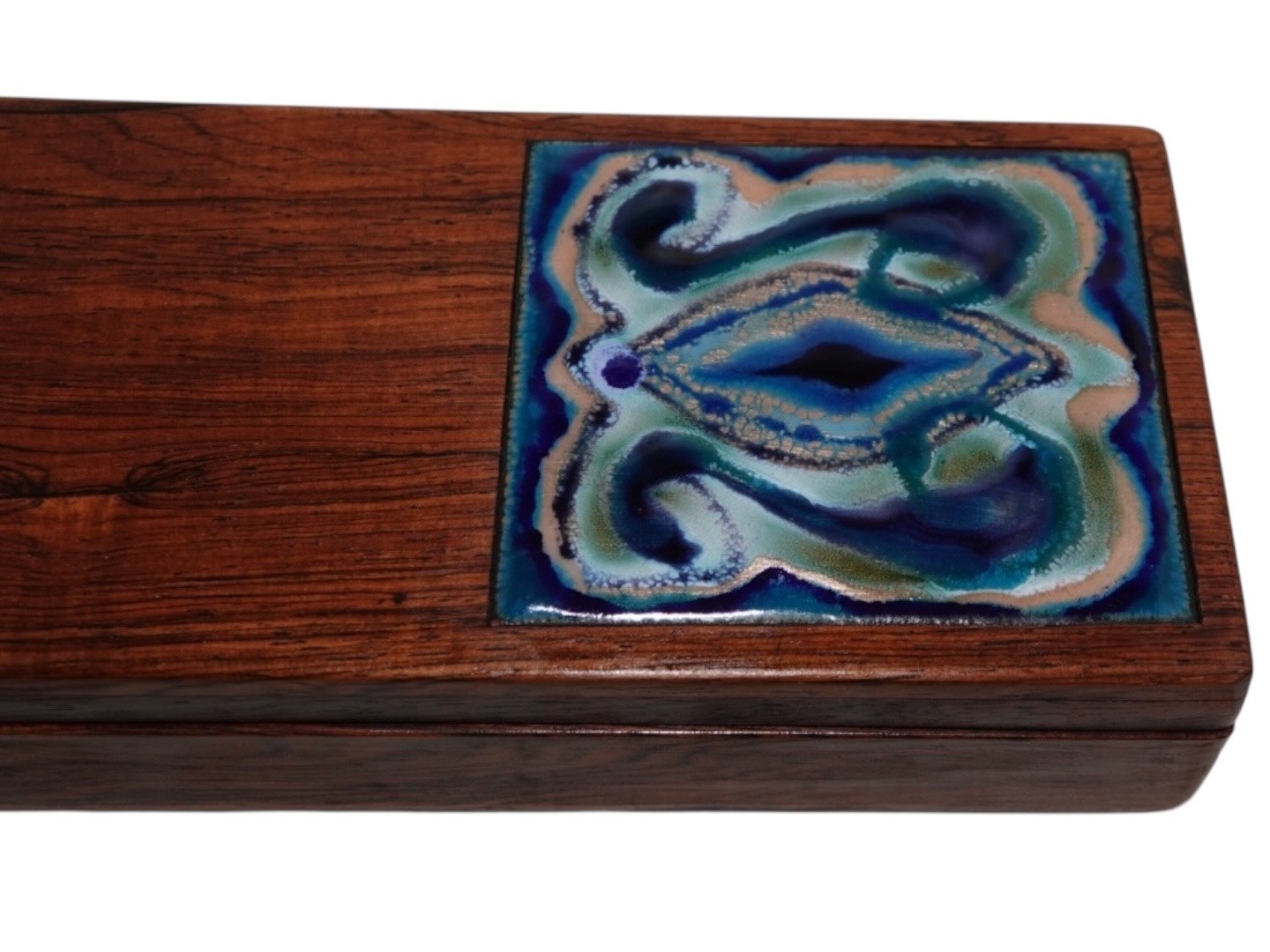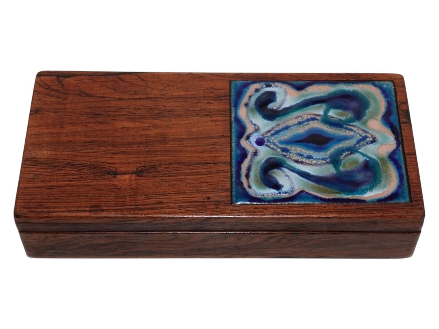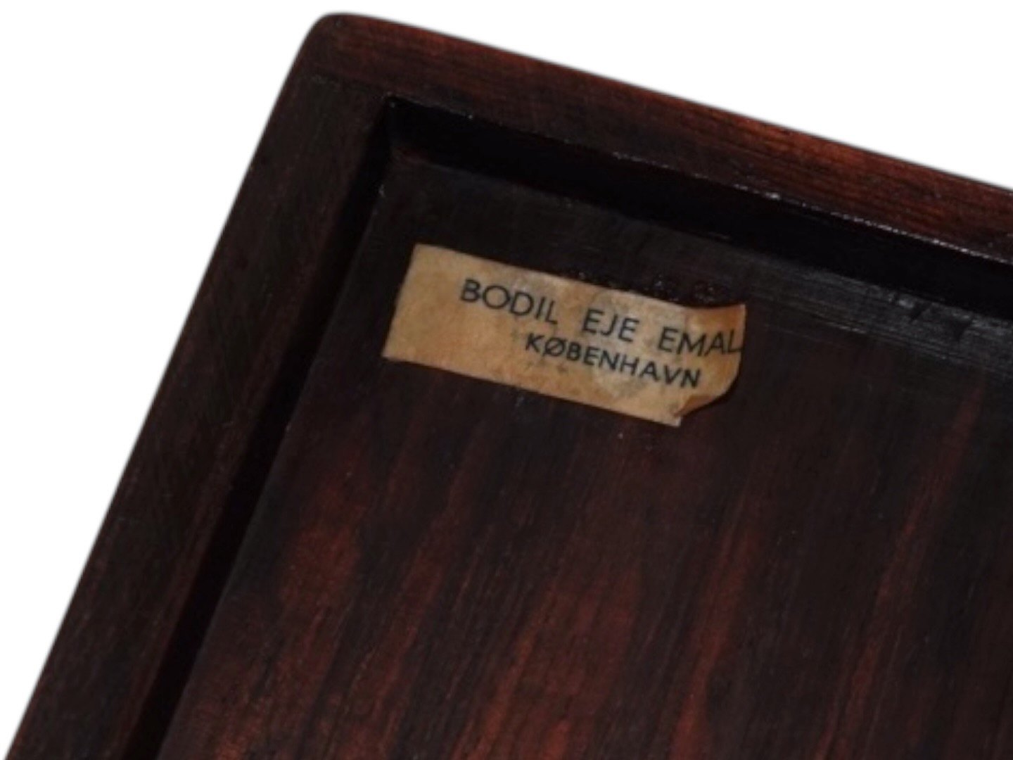 Alfred Klitgaard, lidded rosewood box with Bodil Eje enamel.There is a sticker from "Bodil Eje". The box is not marked "Klitgaard", but we are quite sure it is from Alfred Klitgaard.