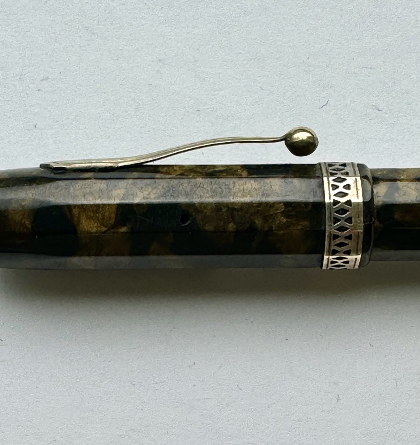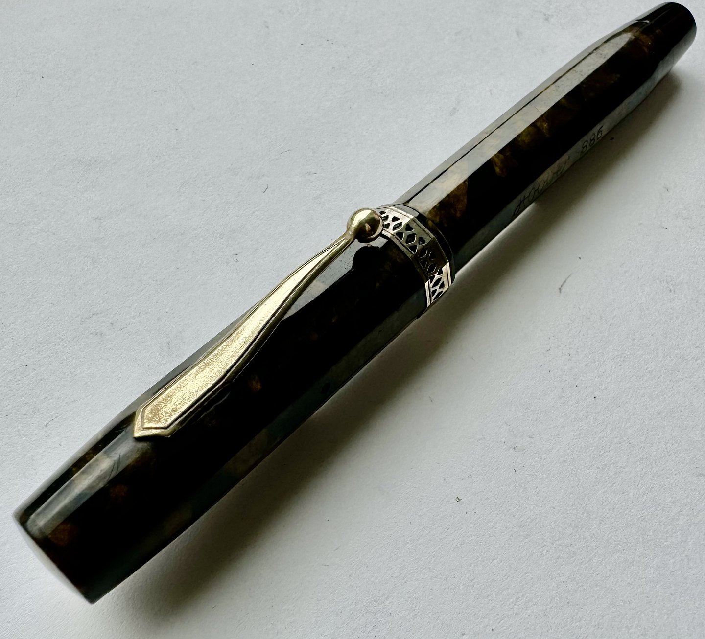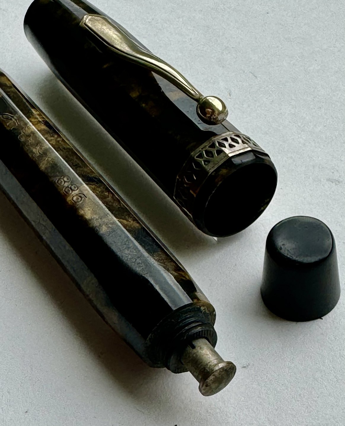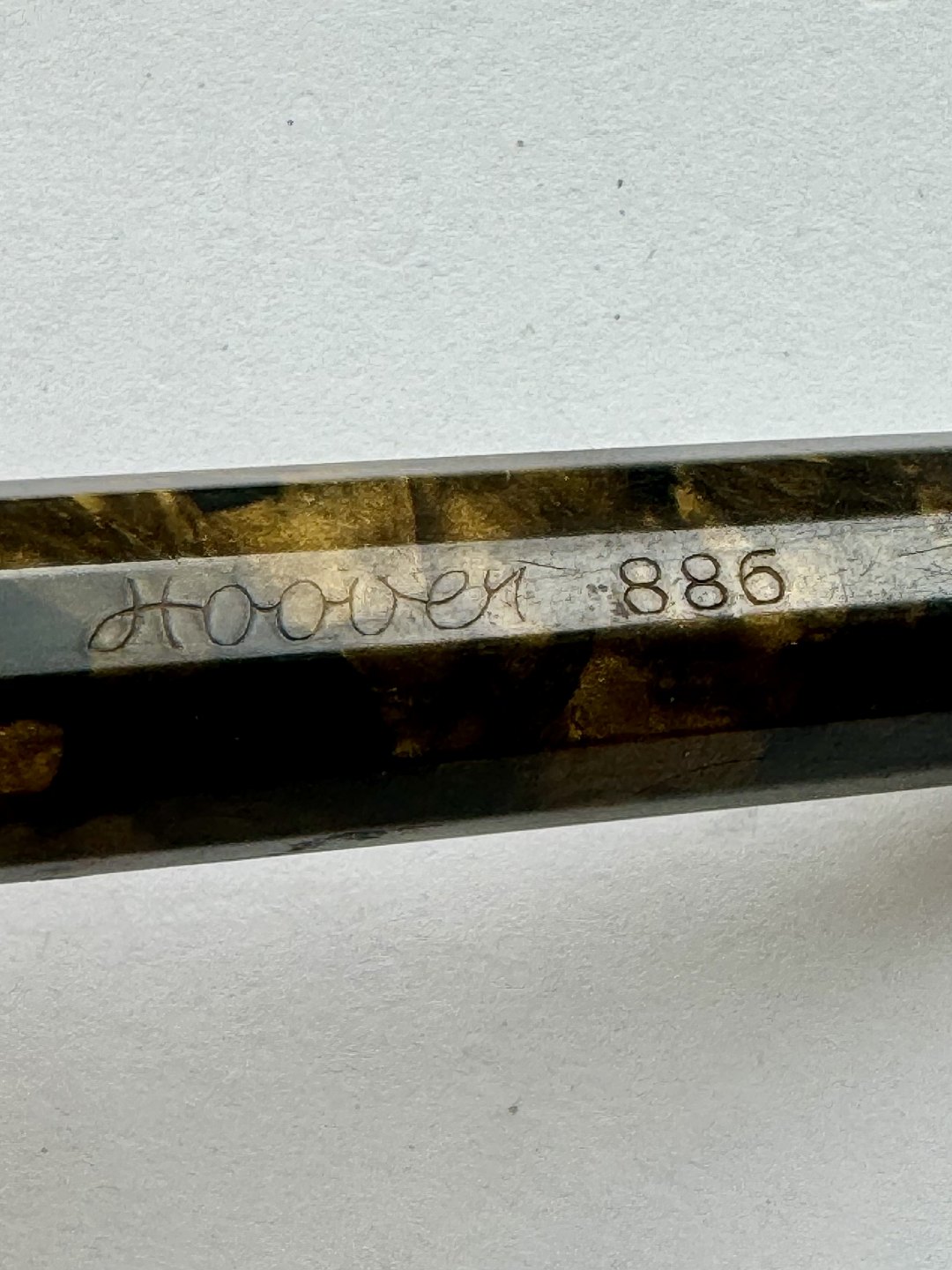 ART DECO STYLE: 12-sided brown/black marbled Hoover #886 fountain pen from the 1930s. Push button filler. Appears in good condition with no damage or repairs. All parts original EXEPT a 14 carat gold nib from Miller. Does not work. A new rubber sack must be inserted before it is functional again. This fountain pen is 13 cm long. Dealer
