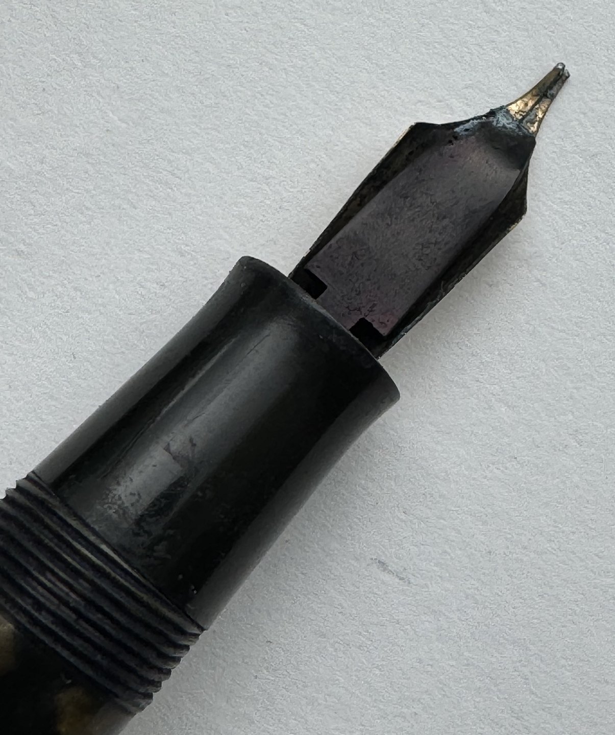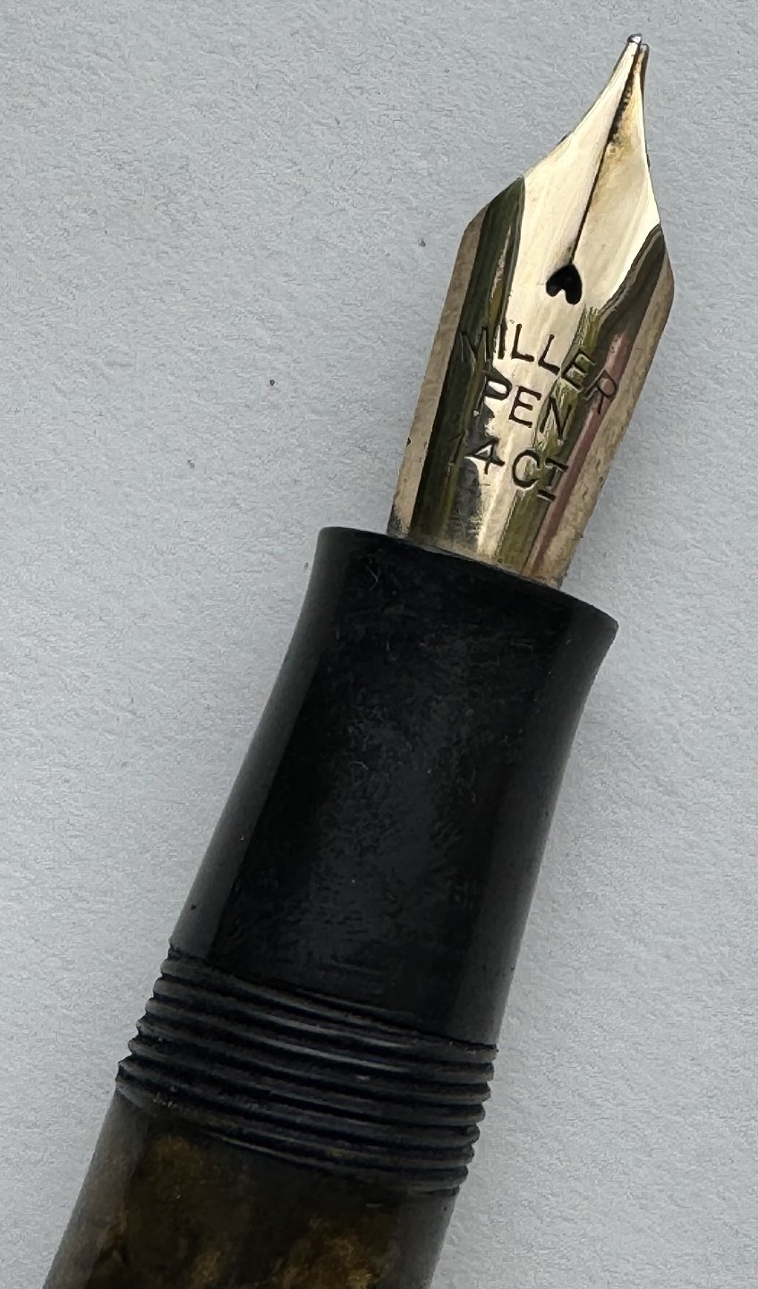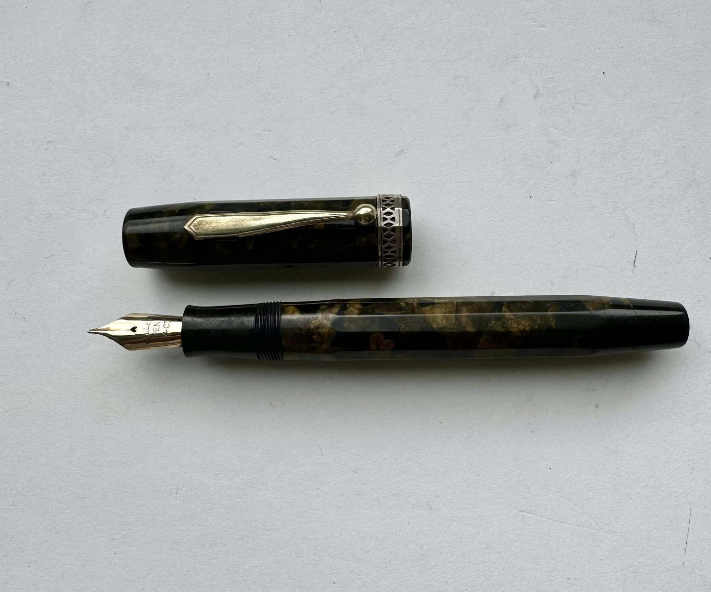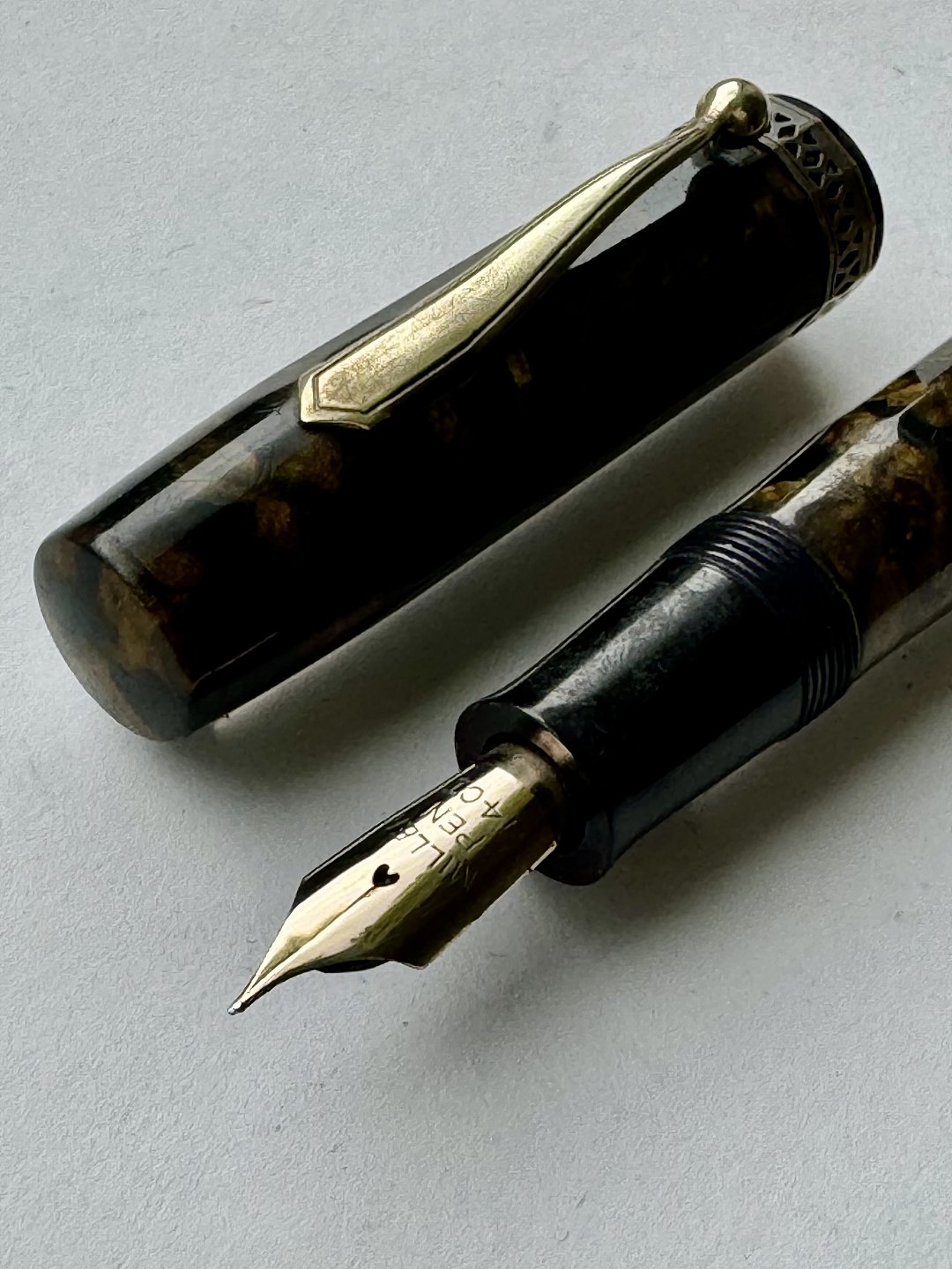ART DECO STYLE: 12-sided brown/black marbled Hoover #886 fountain pen from the 1930s. Push button filler. Appears in good condition with no damage or repairs. All parts original EXEPT a 14 carat gold nib from Miller. Does not work. A new rubber sack must be inserted before it is functional again. This fountain pen is 13 cm long. Dealer