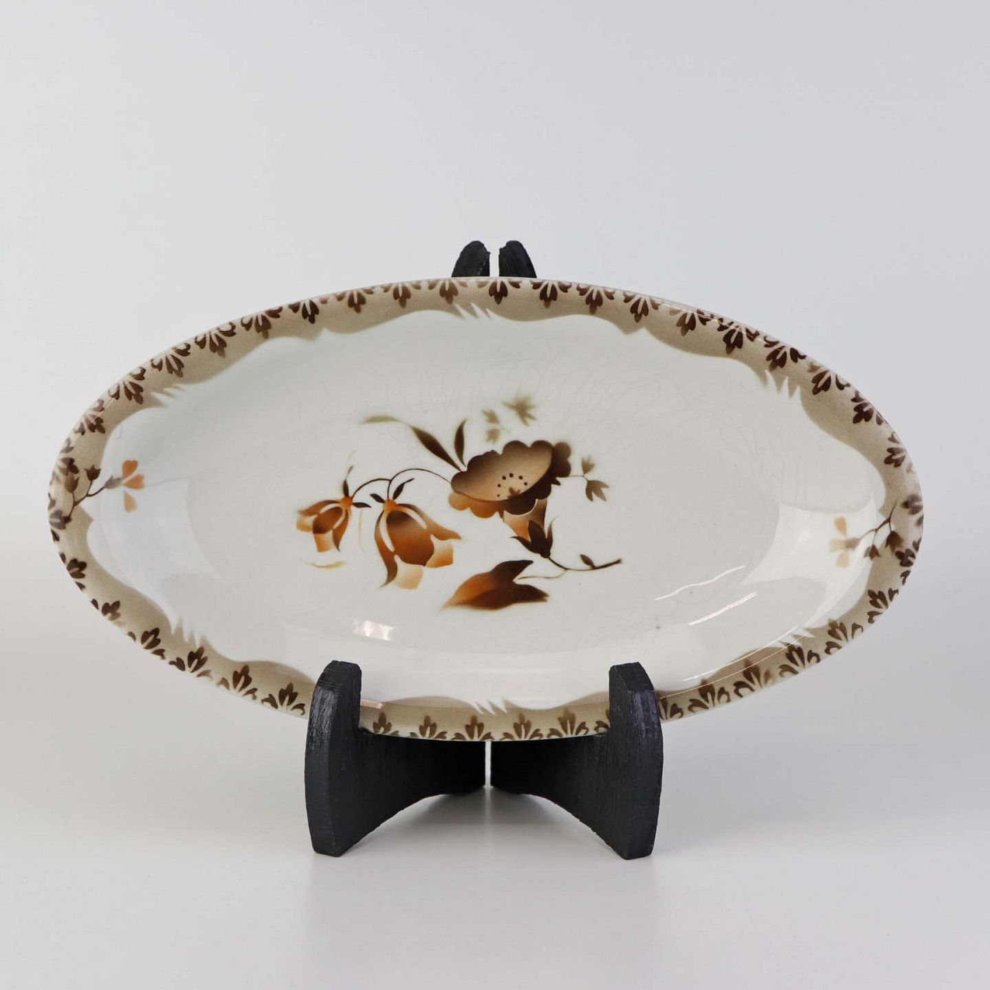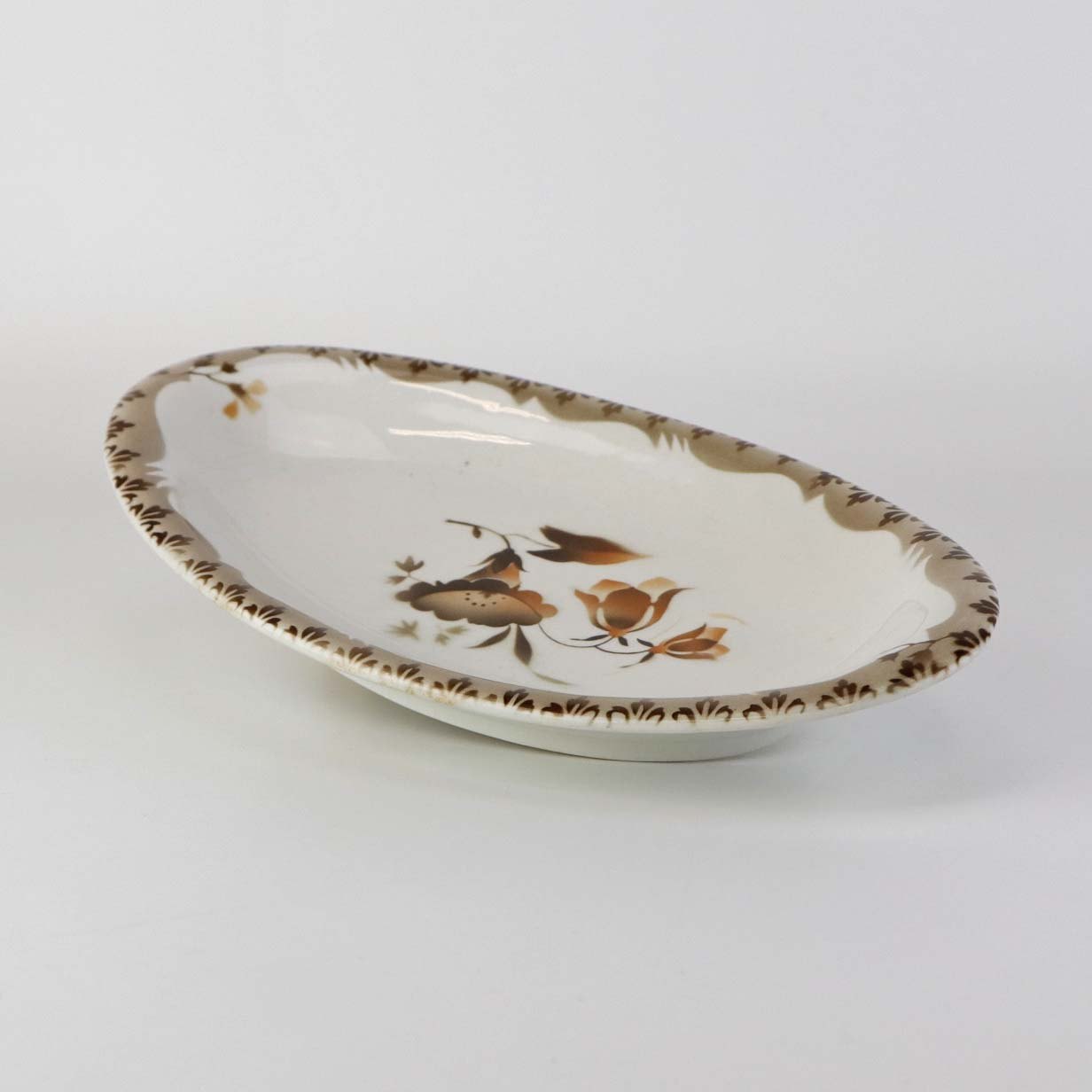 Lille ovalt fad i fajance fra stellet Convolvulus Snerle. Formgiver Nils Thorsson, Nic. Tidemand og Oluf Jensen