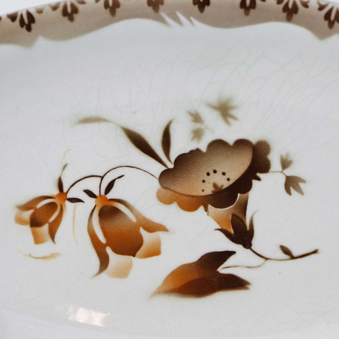 Stel i glat hvid fajance i stelform C med dekoration af brune snerleblomster og lysebrun kant med bladmotiv. Stellet blev produceret i perioden år 1930-1941