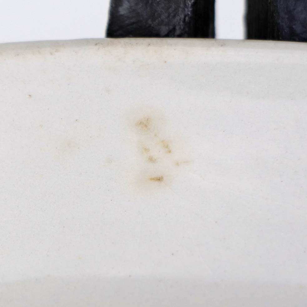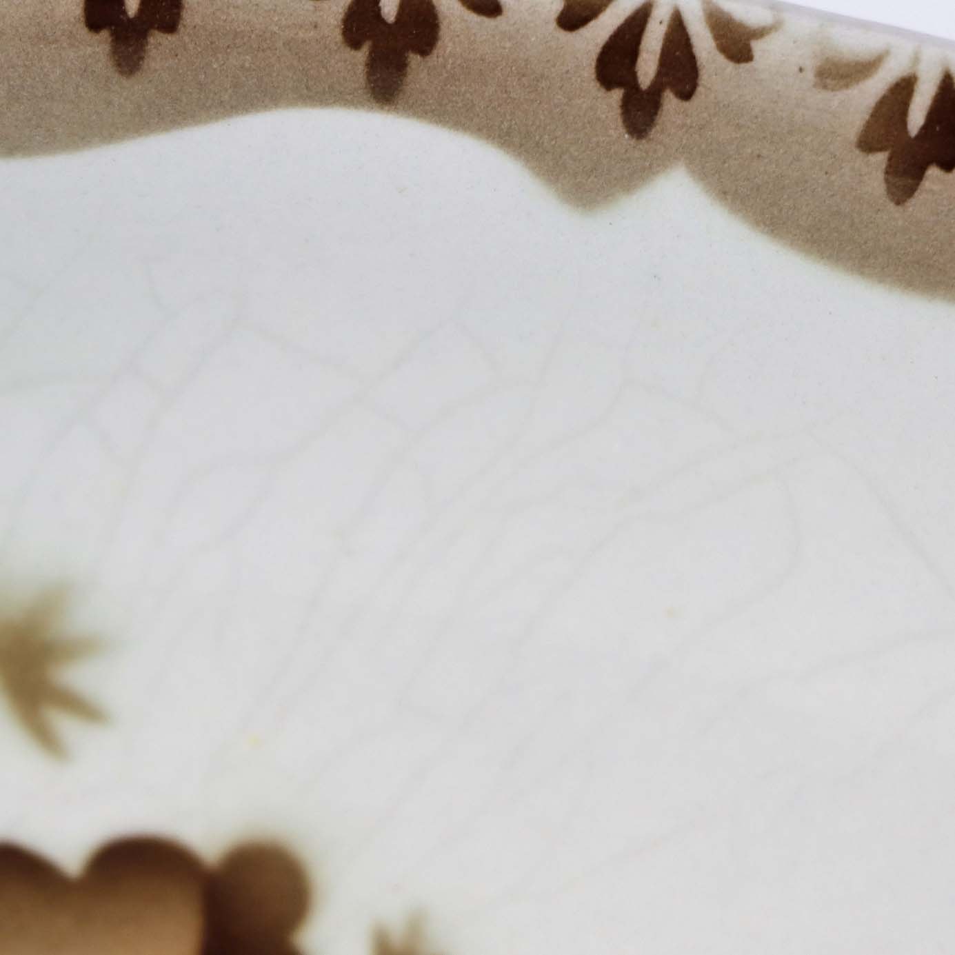 Fremstår med krakkeleringer i glasuren samt mindre område med mørkning under glasuren på fadets underside.