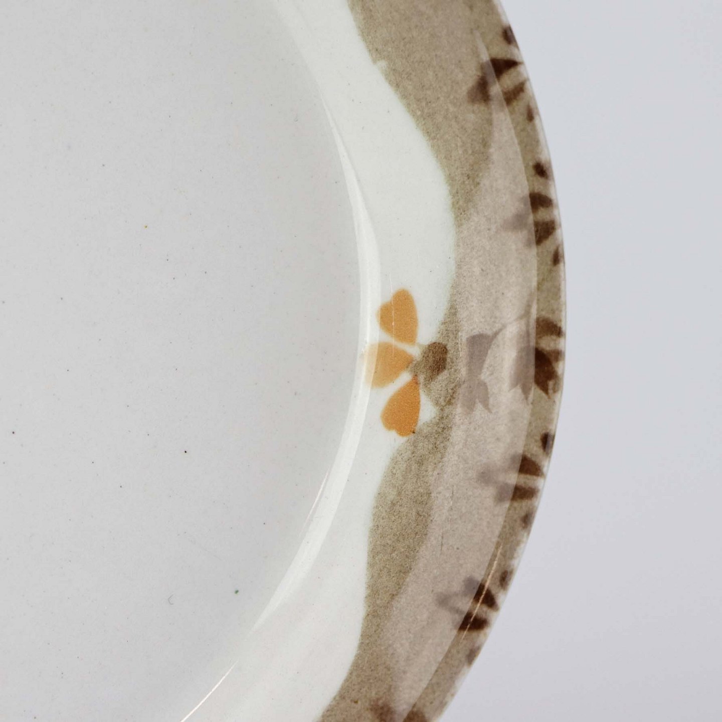 Stel i glat hvid fajance i stelform C med dekoration af brune snerleblomster og lysebrun kant med bladmotiv. Stellet blev produceret i perioden år 1930-1941