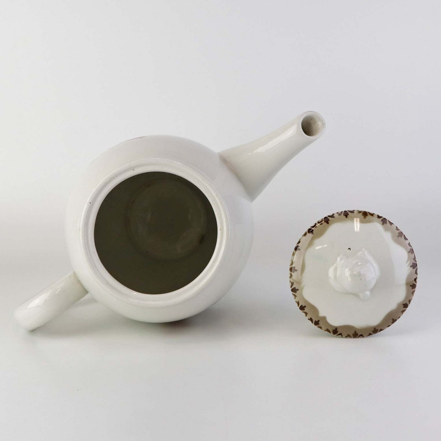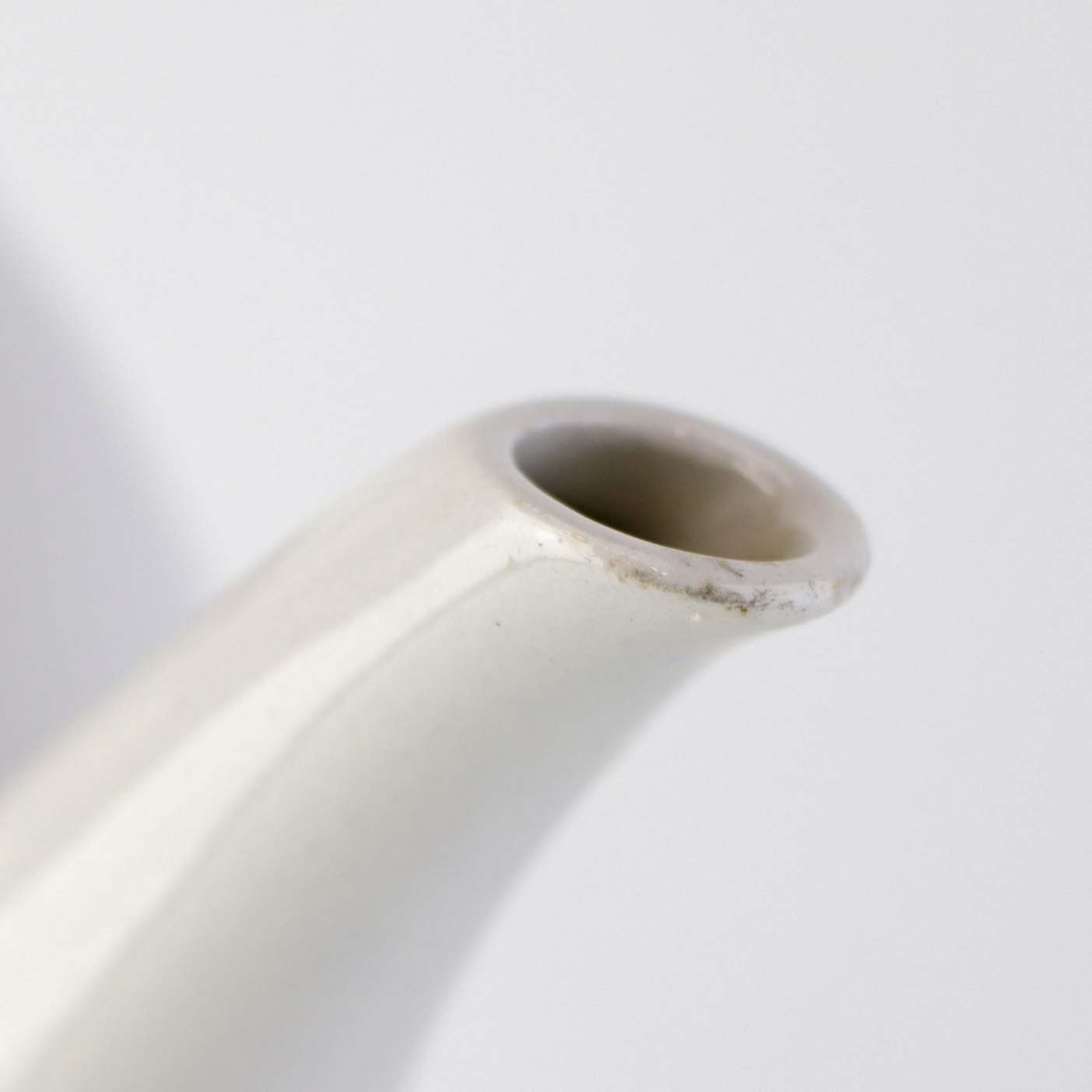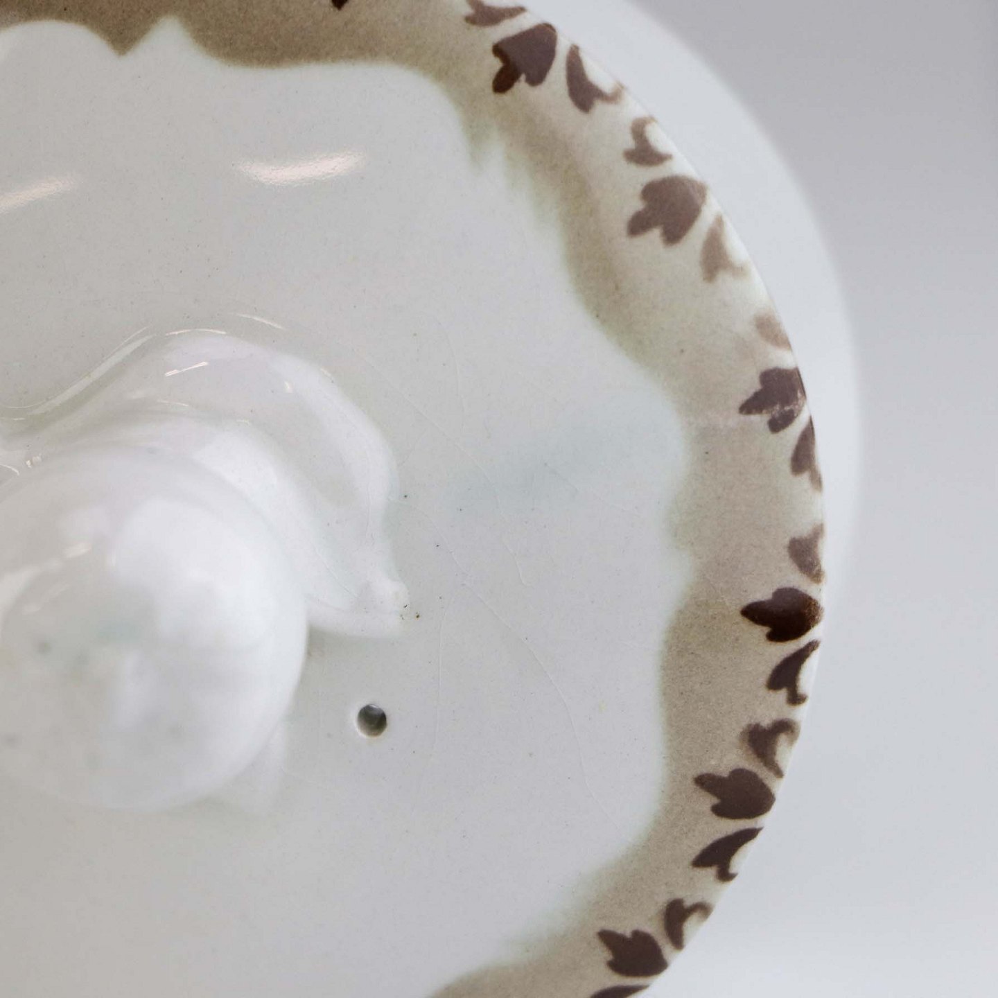 Fremstår med indvendige brugsspor, mindre slid på glasuren på tuden, utydelig grønlig streg under glasuren på låget, ujævnhed i topkanten og brugsspor under bunden.