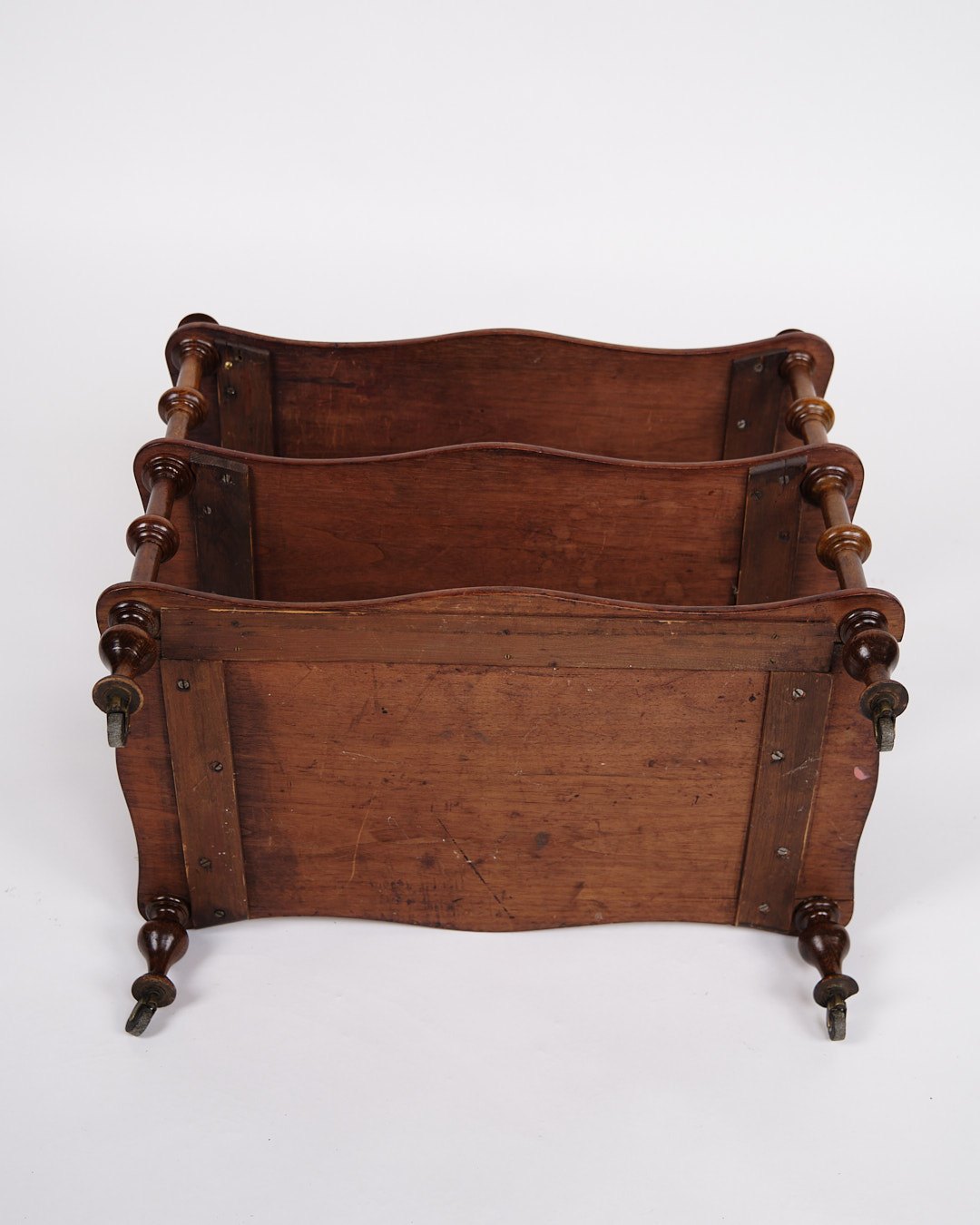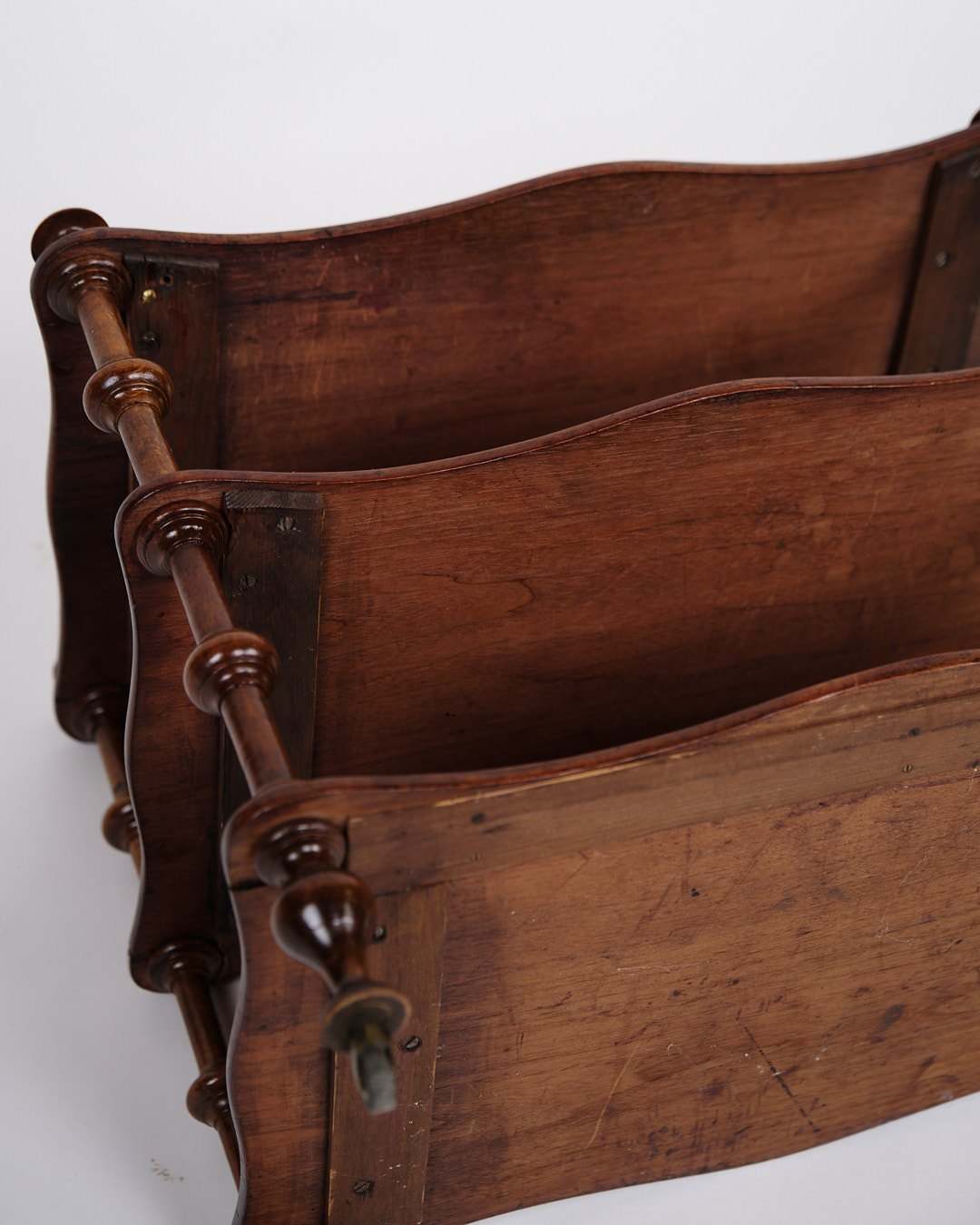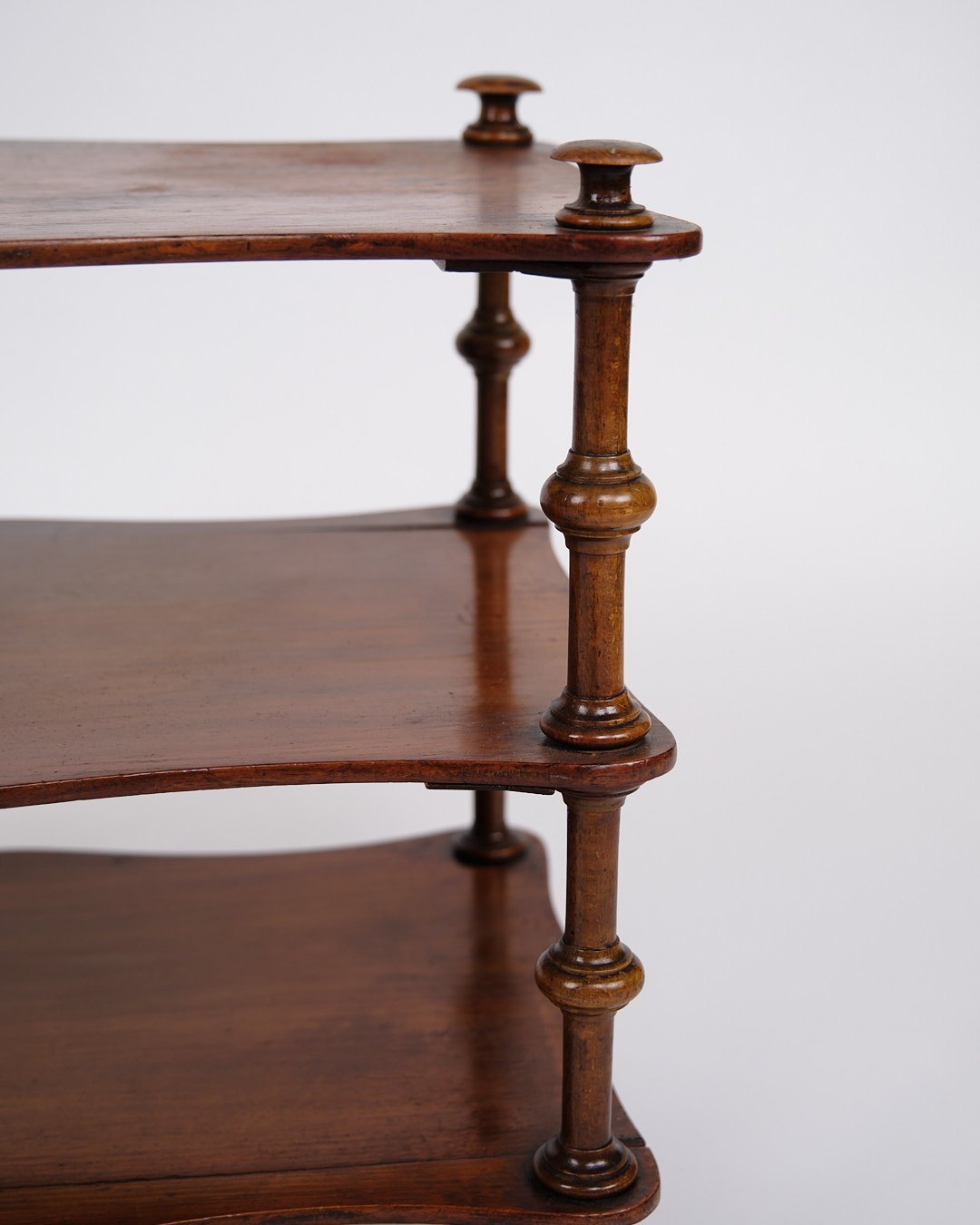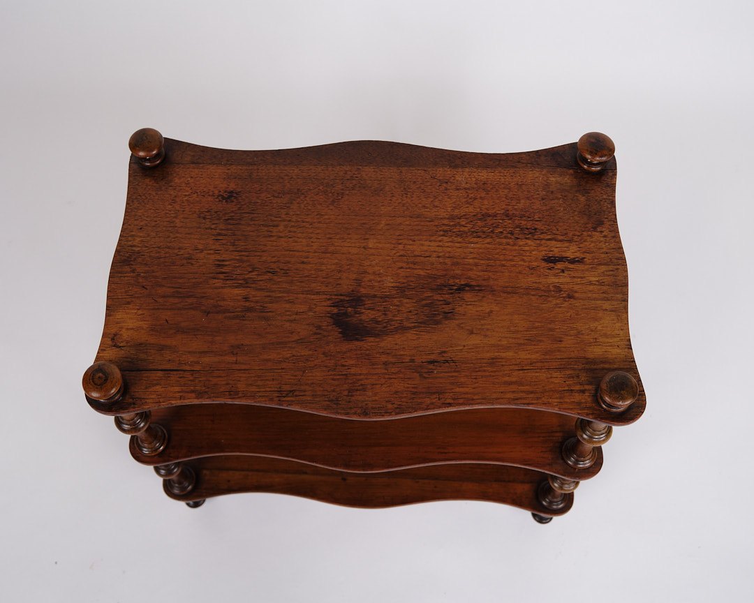 etagere/reol fra 1800-tallet, udført i mahogni. Møblet er indrettet med tre hylder og detaljerede drejede søjler. Nederst er det monteret med små hjul, hvilket giver både funktionalitet og mobilitet.Et dekorativt og anvendeligt antikt møbel, der kombinerer praktisk opbevaring med klassisk snedkerhåndværk.