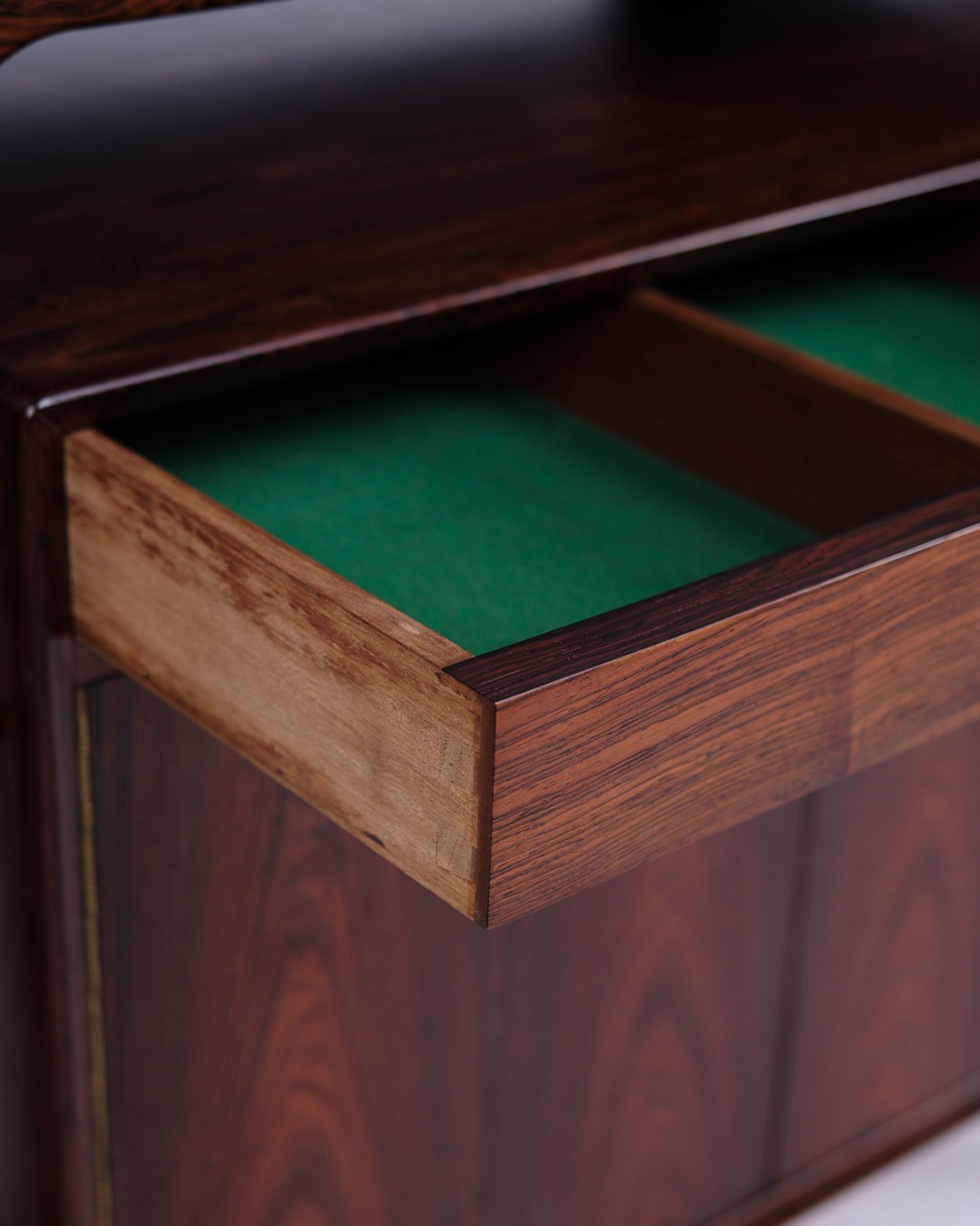 barskab fra Dyrlund, udført i palisander med sort formika og håndtag i massiv palisander. Skabet er monteret på hjul for nem mobilitet og har en foldbar plade, der kan udvide bredden fra 86 cm til 142 cm. Kombinationen af eksklusive materialer og funktionelt design gør dette barskab til et klassisk eksempel på dansk møbelhåndværk fra 1960’erne.— Oprindelse: Danmark