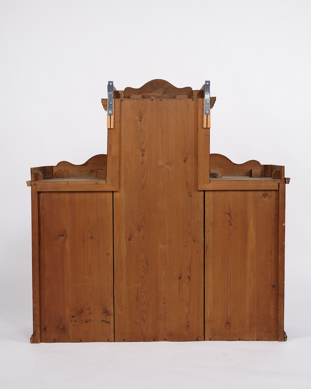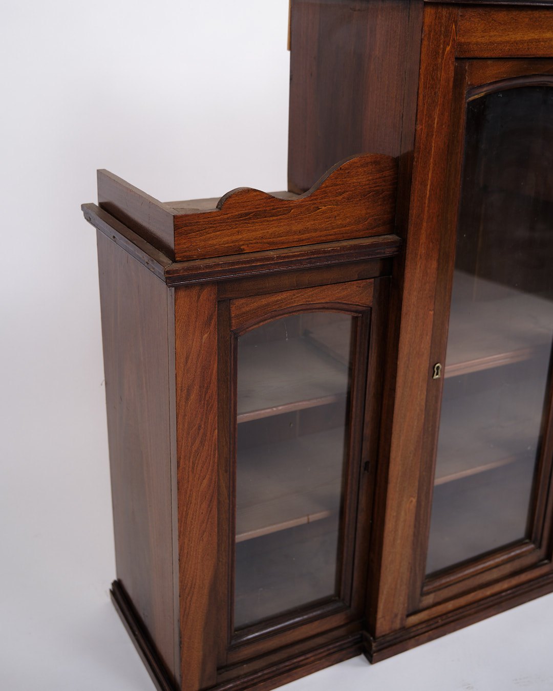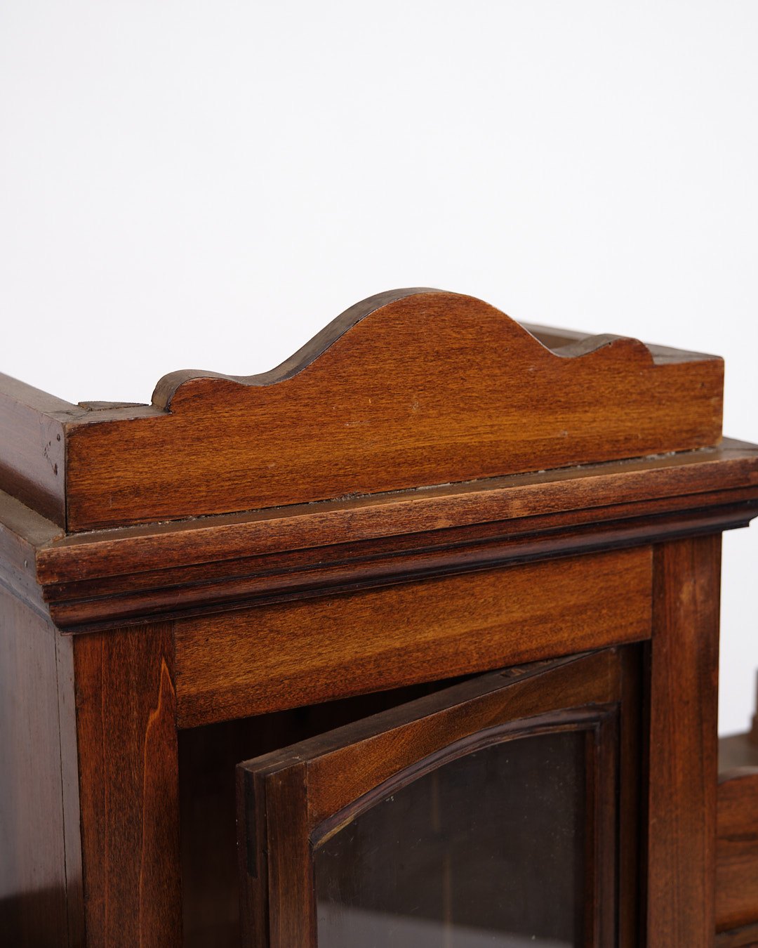 væghængt vitrineskab fra 1890’erne, udført i håndpoleret mahogni. Skabet har klassiske proportioner og fremstår med et tidstypisk design fra slutningen af 1800-tallet, hvor funktionalitet og dekorativt udtryk gik hånd i hånd.— Periode: 1890’erne