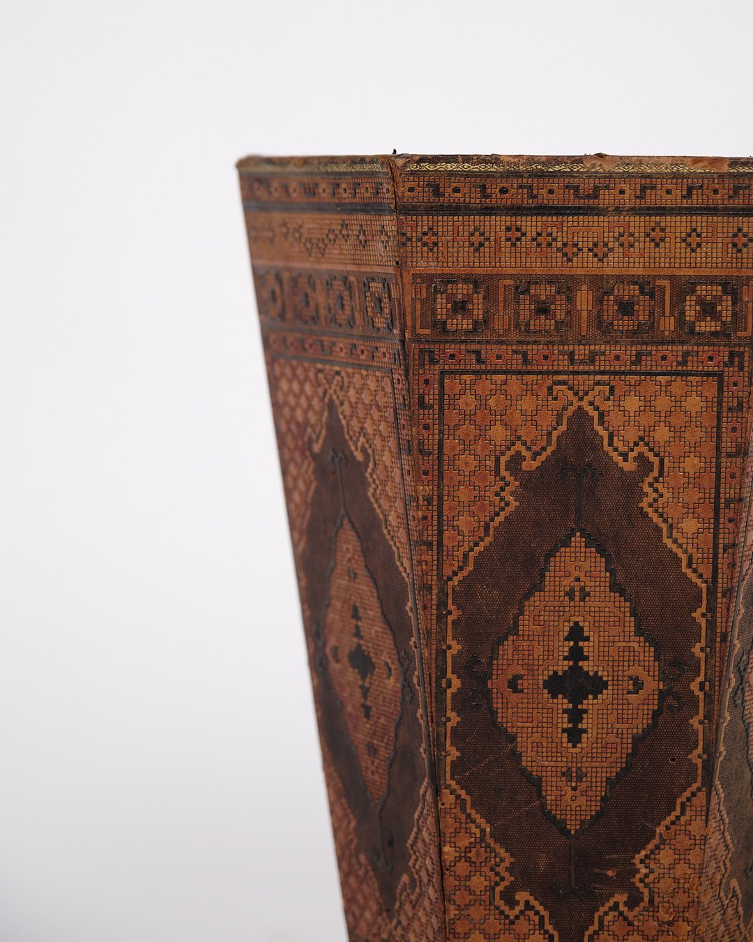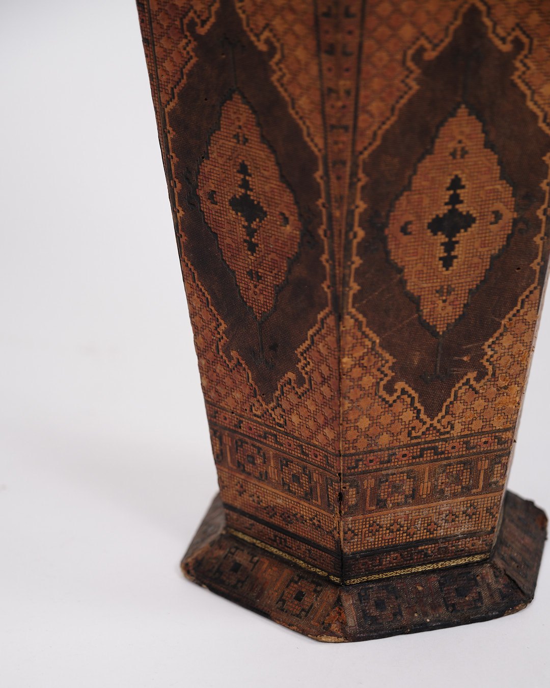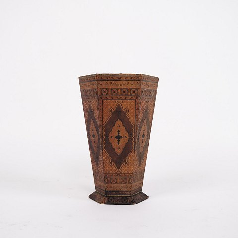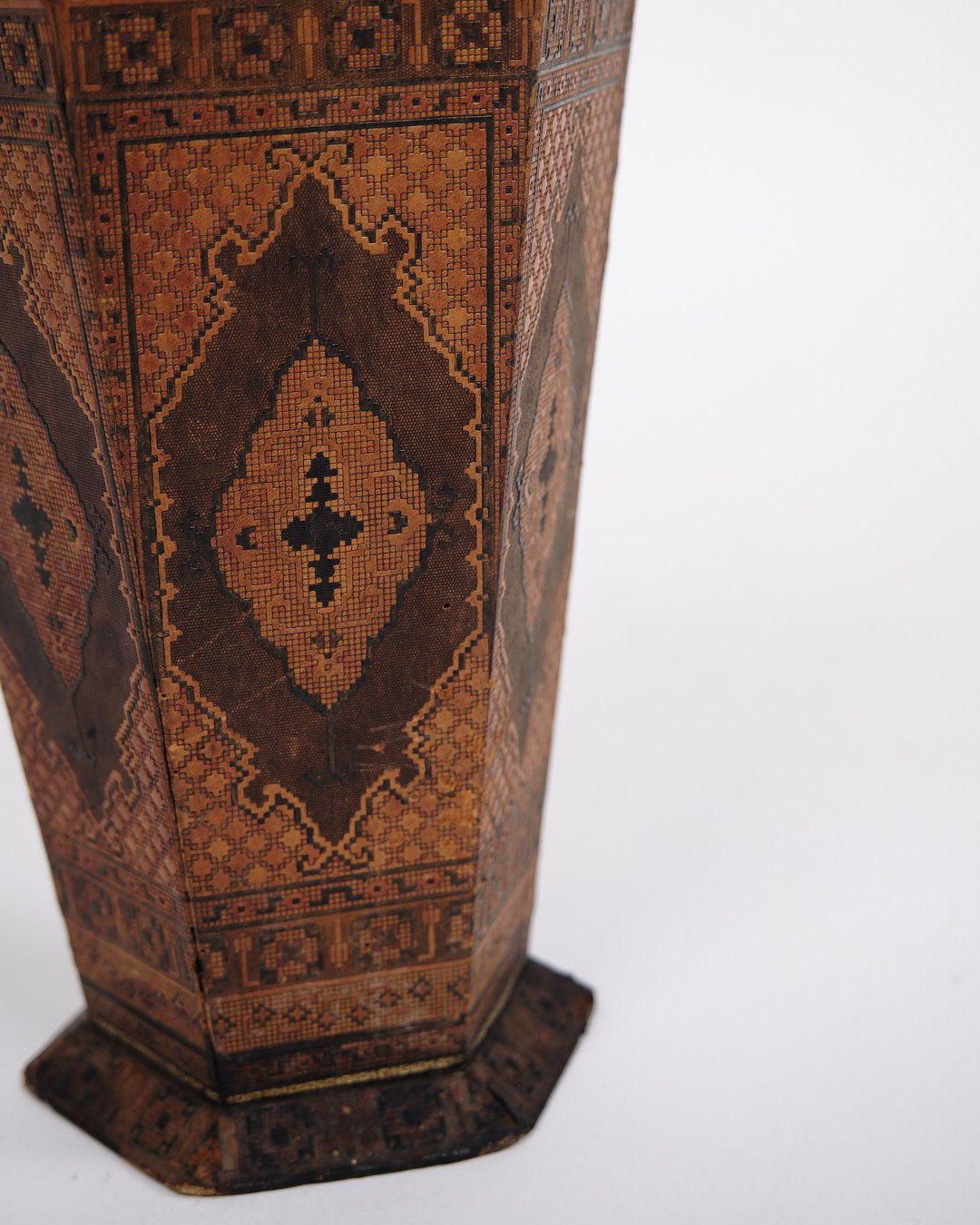 Dekorative Vase aus den 1900er Jahren, gefertigt aus dunklem Holz mit schöner, orientalisch inspirierter Intarsienarbeit.— Epoche: 1900er Jahre