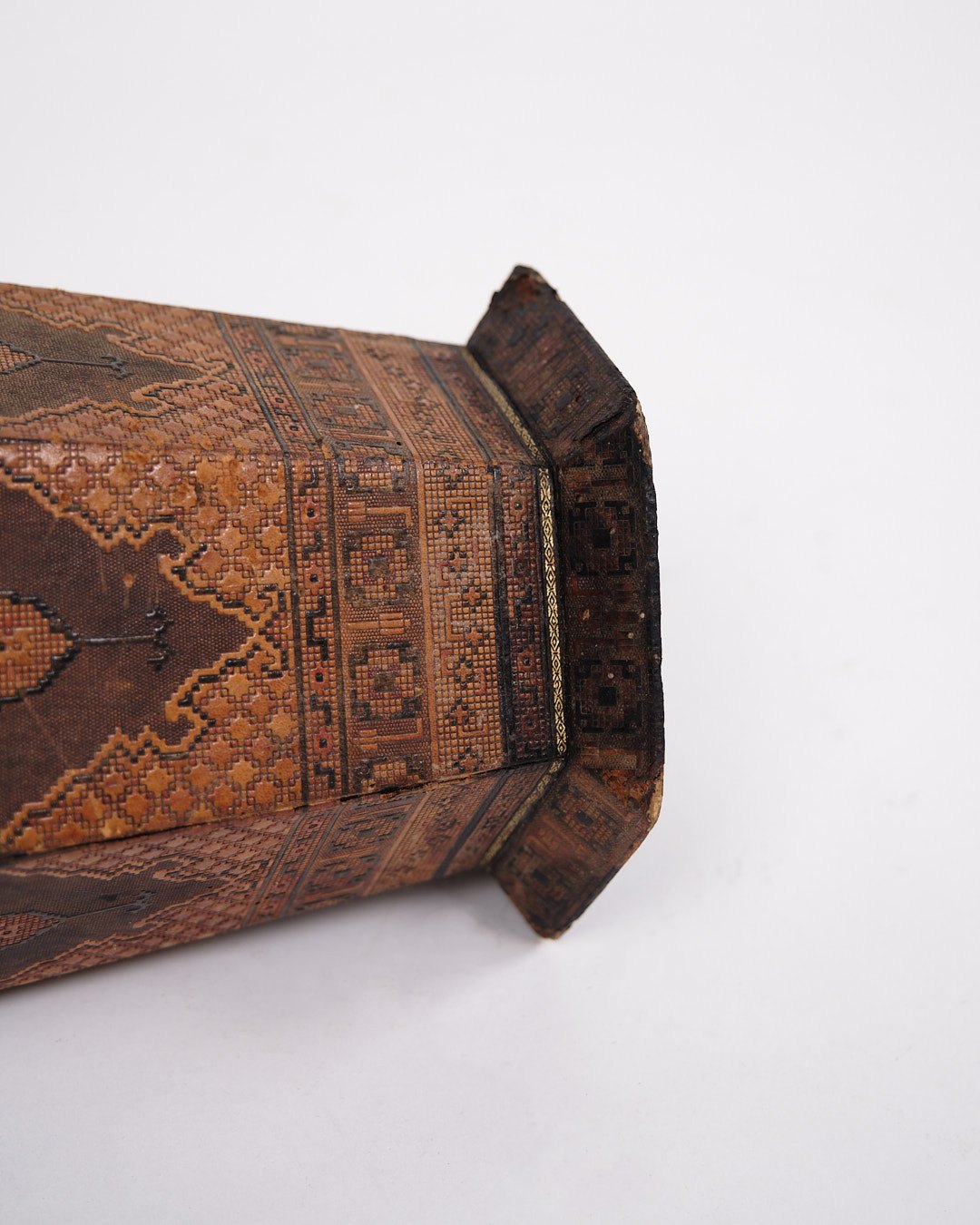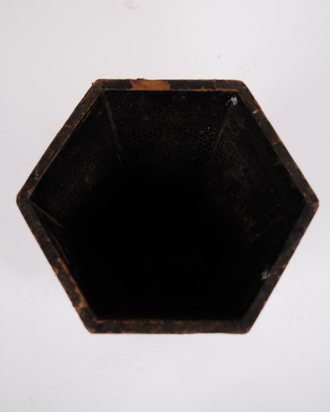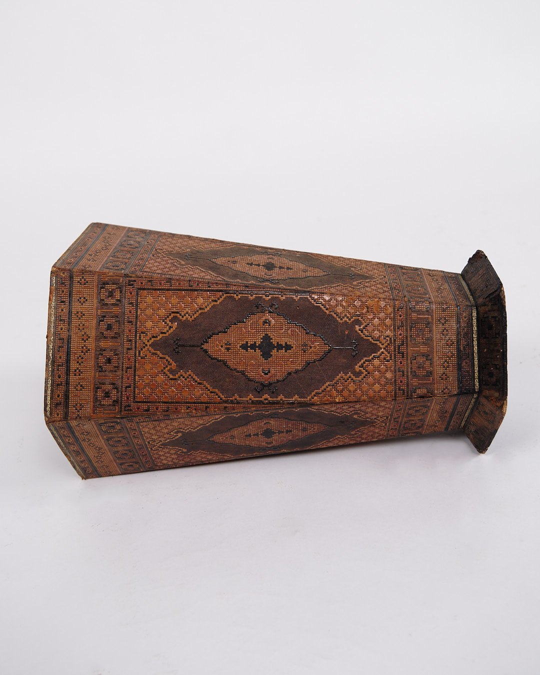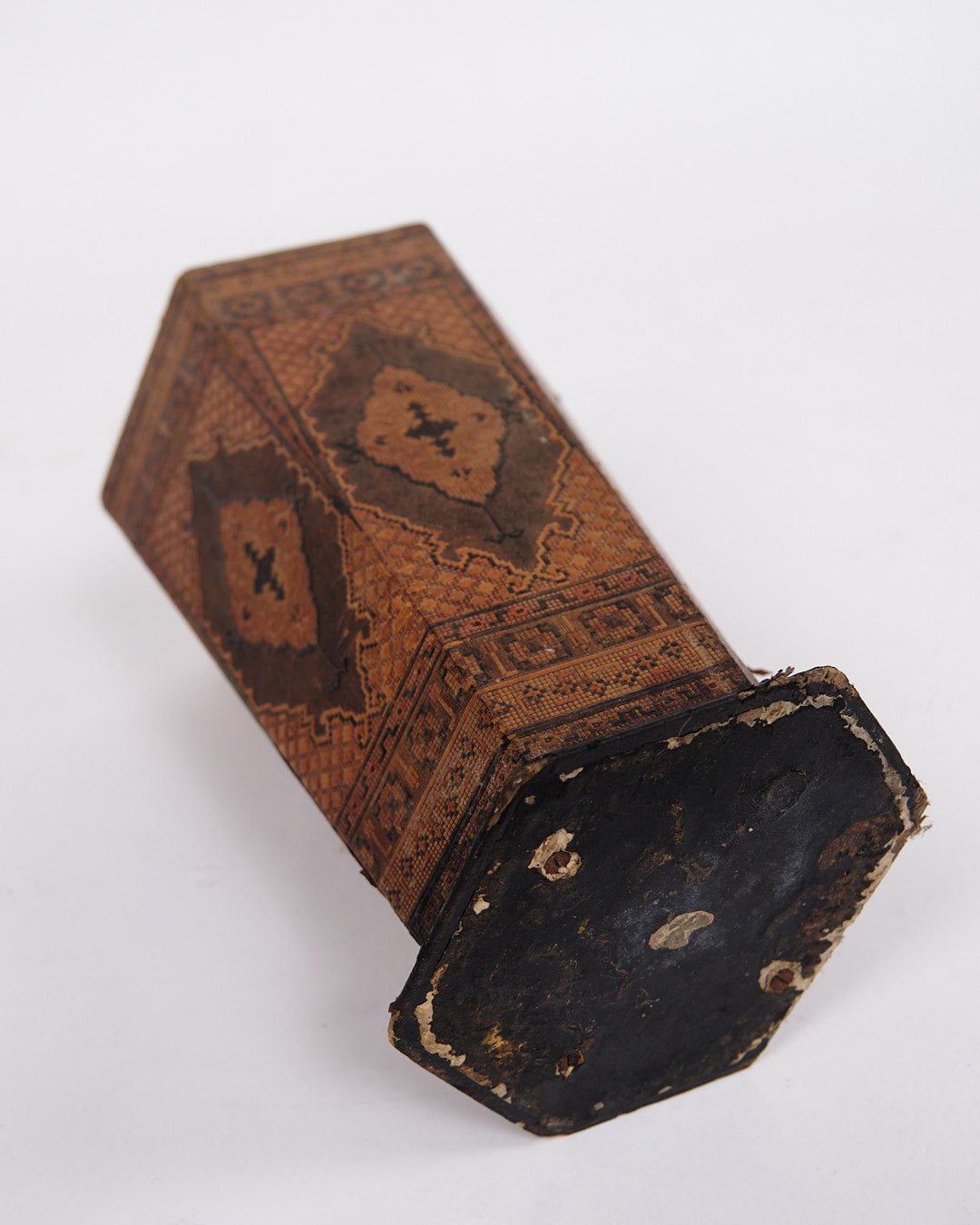 Dekorative Vase aus den 1900er Jahren, gefertigt aus dunklem Holz mit schöner, orientalisch inspirierter Intarsienarbeit.— Epoche: 1900er Jahre