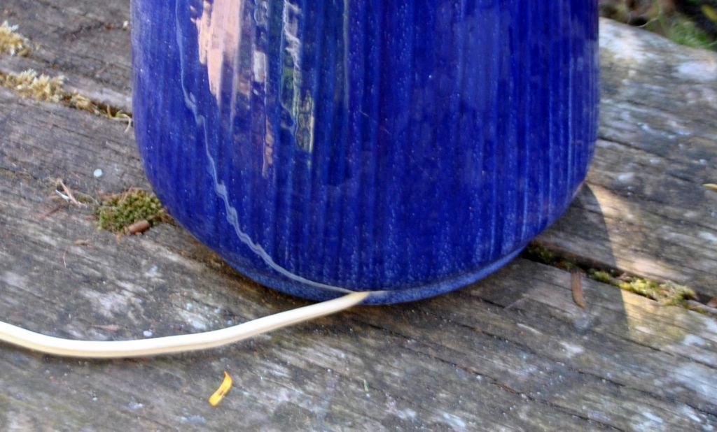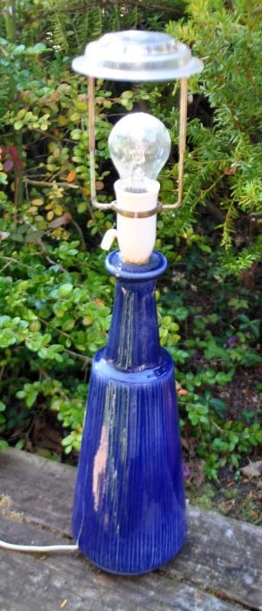 Keramik-Tischlampe mit blauer Glasur, 20. Jahrhundert. Dänemark. Mit Rillen. Ungestempelt. Höhe ohne Elektroinstallation: 37 cm. Mit Elektroinstallation: 58 cm. In der Lampe ist ein Loch für das Kabel gebohrt.Ausgezeichneter Zustand.