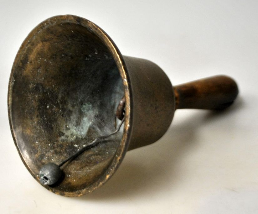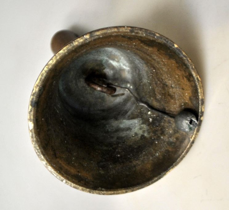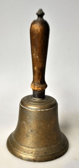 Antike barocke Tischglocke aus Erz aus dem 18. Jahrhundert. Mit einem Griff aus gedrechseltem Holz. H.: 22 cm.Achtung: Der Griff ist geteilt.