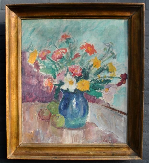 Moe, Andreas Carl (1877 - 1952) Dänemark: Vase mit Blumen auf einem Tisch. Öl auf Leinwand. Signiert. 63 x 51 cm.Gerahmt: 71 x 64 cm.