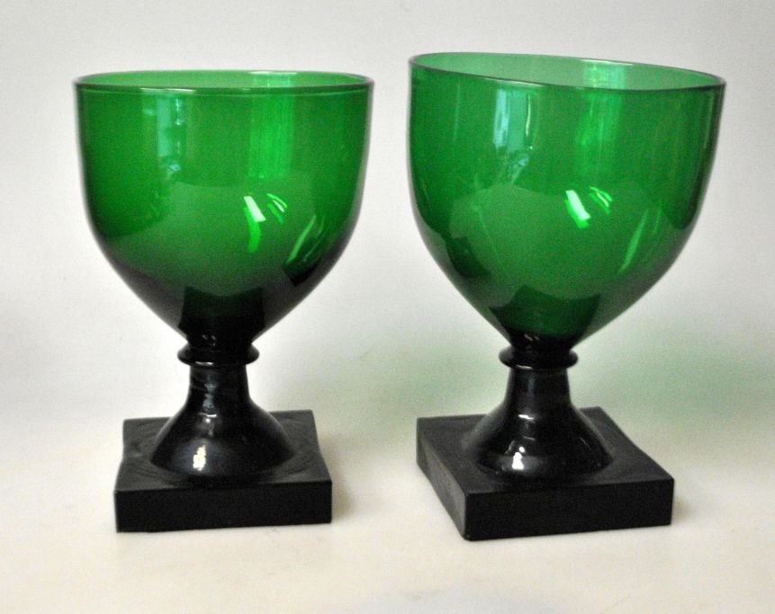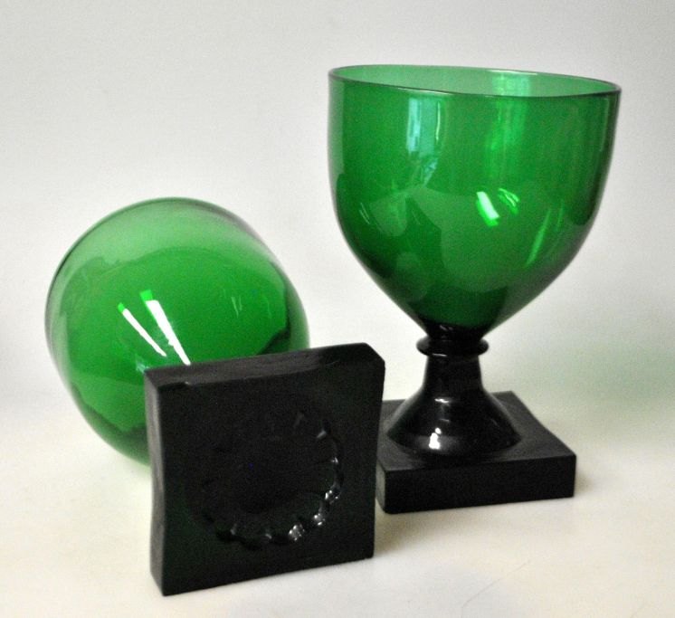 Weinglas „Gorm der Alte“, 19. Jahrhundert. Ganz aus grünem Glas. Quadratischer, gepresster Fuß mit Muster unter dem Boden und Kugelschliff. Höhe: 13 cm.Wirklich selten!