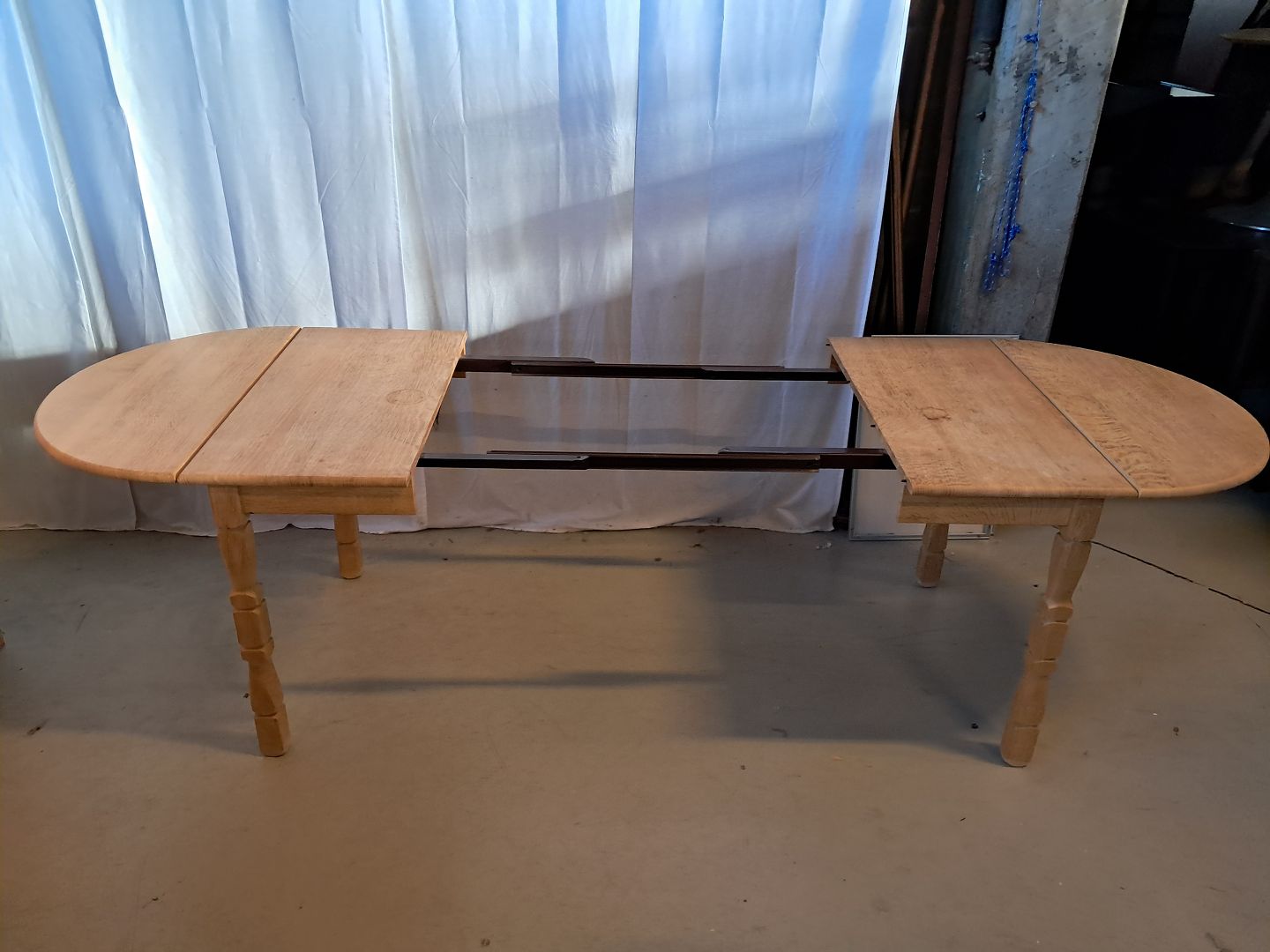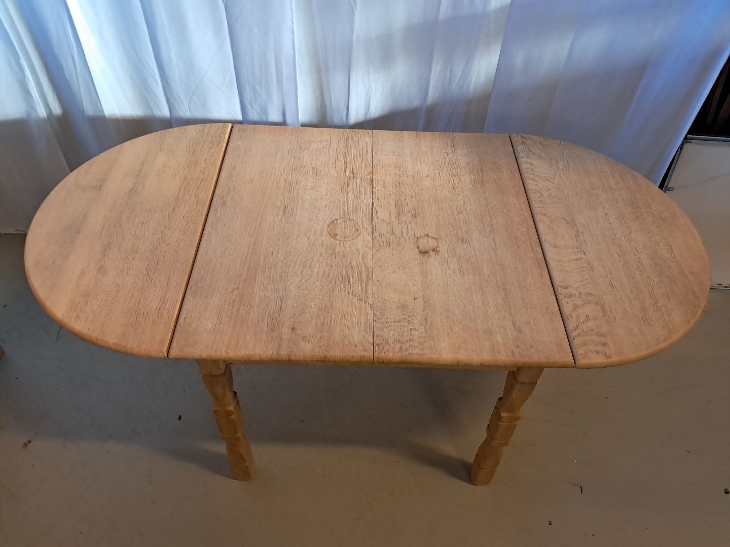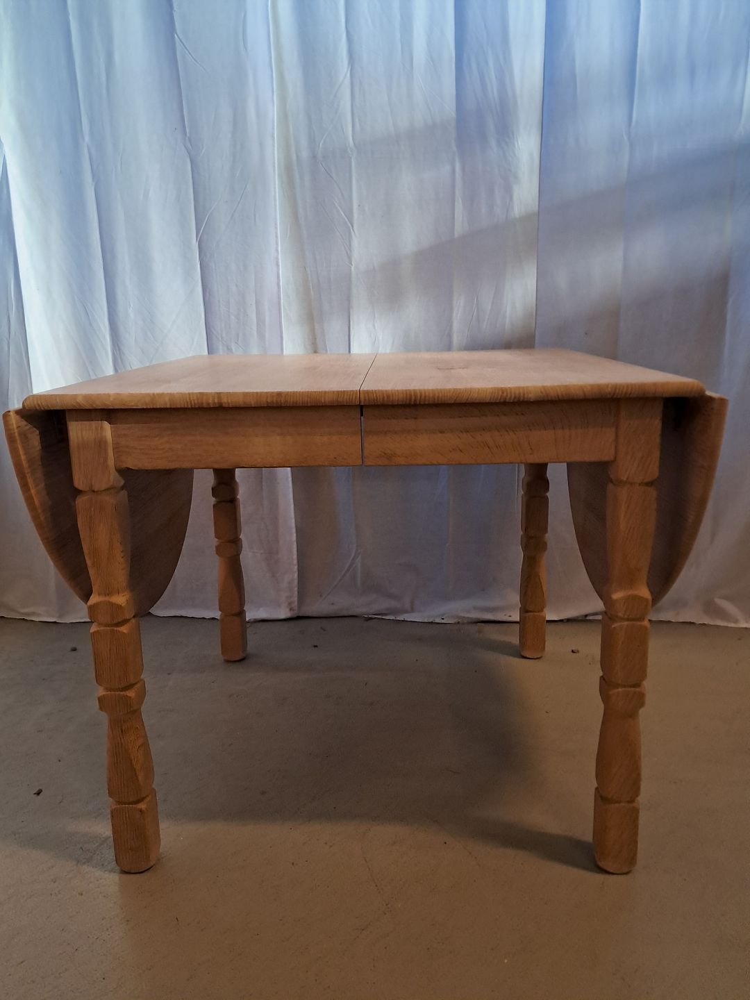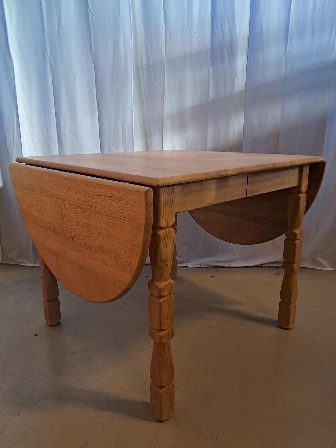 Spisebord med klapper i massivt egetræ , fra 1980erne.Der medfølger 2 tillægsplader og det har 2 skjolder på pladen.(se foto)